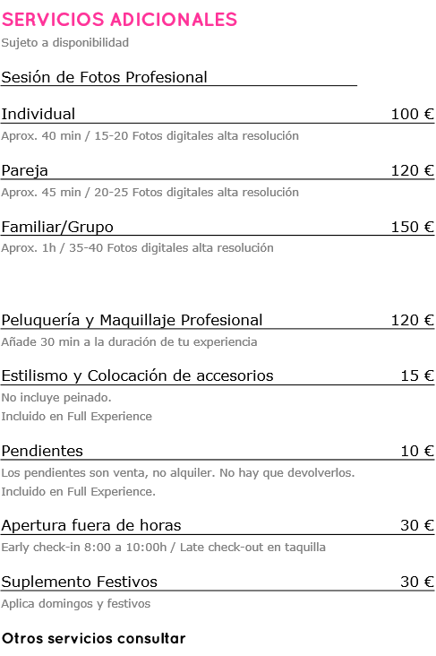La mayoría de la gente devuelve el look una vez finalizada la sesión de fotos pero, si te apetece, puedes disfrutarlo el resto del día sin coste adicional (sujeto a disponibilidad).