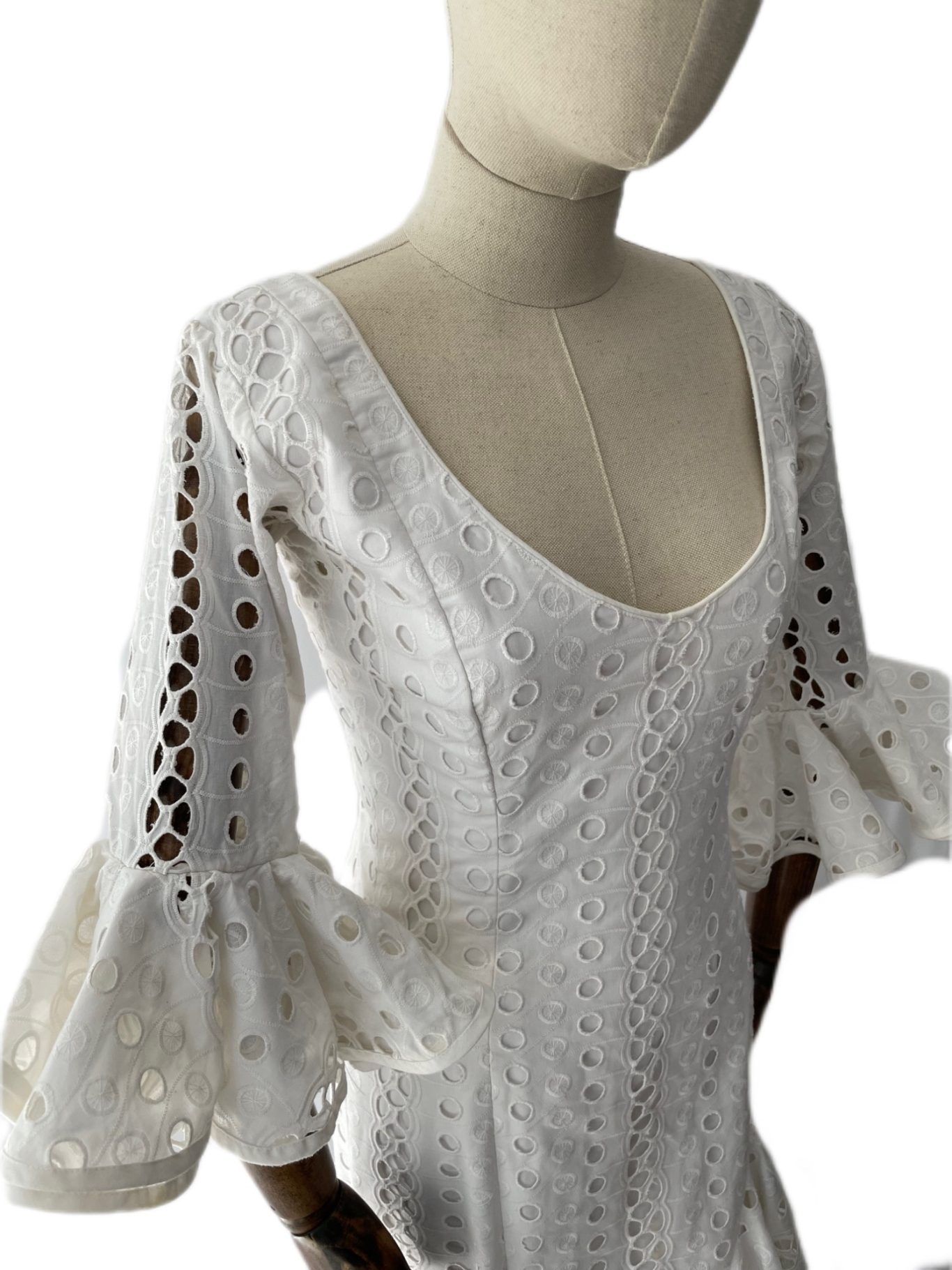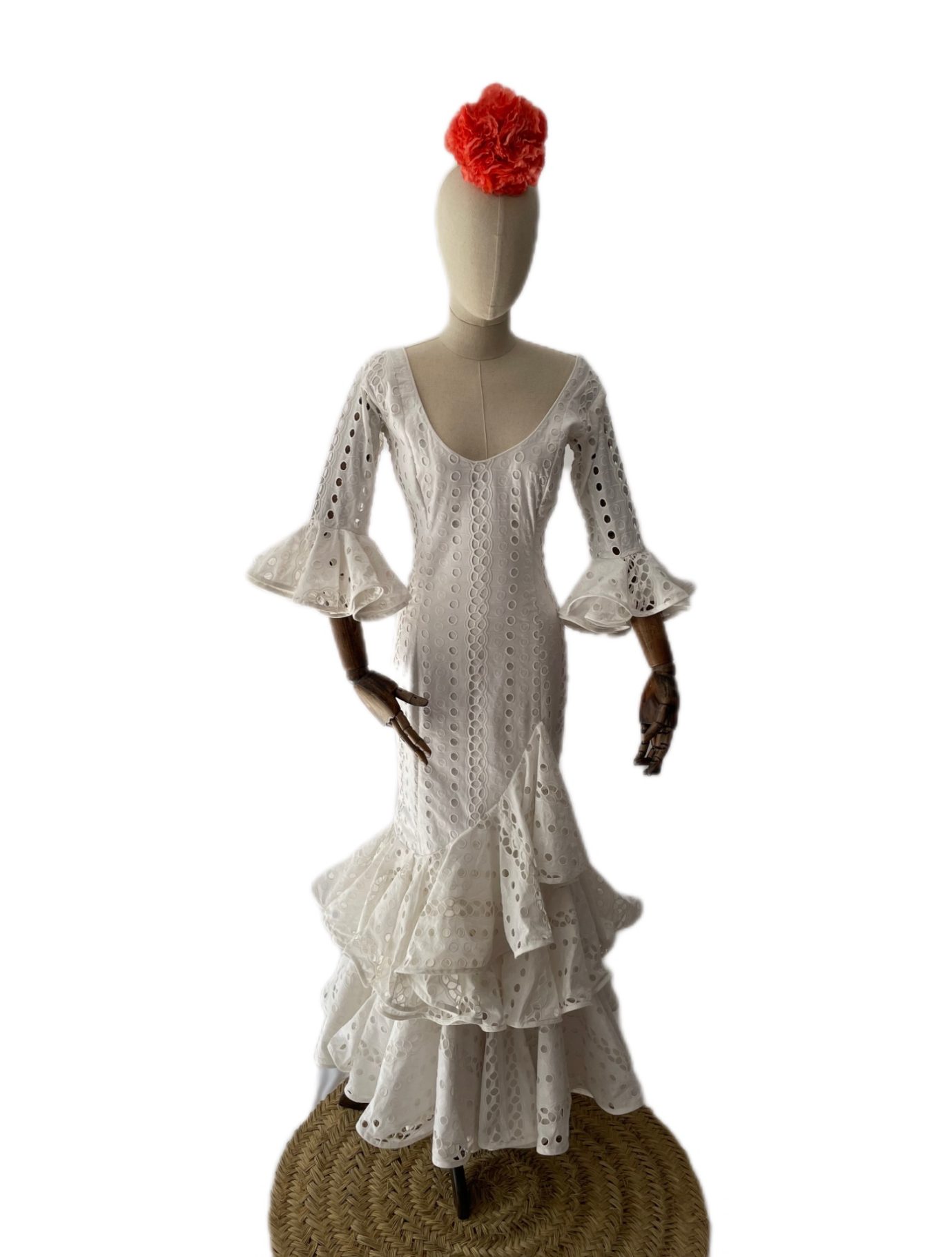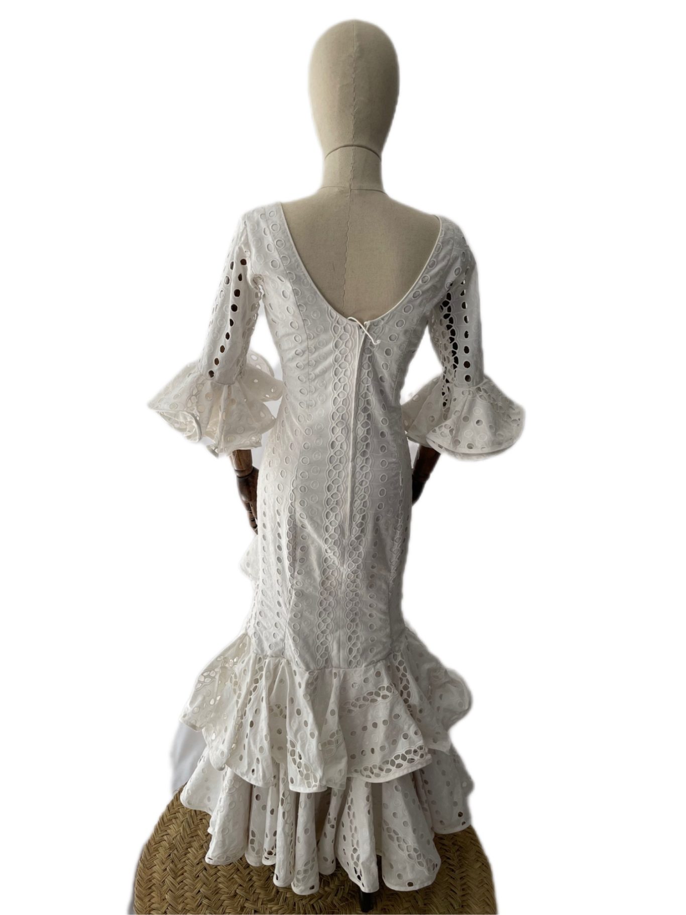 Traje de flamenca blanco en tejido de algodón perforado. Talle bajo con falda de tres volantes de capa y ligera subida en el volante superior. Mangas rematadas en volantes a juego con la falda. Escote redondeado en pecho y espalda.