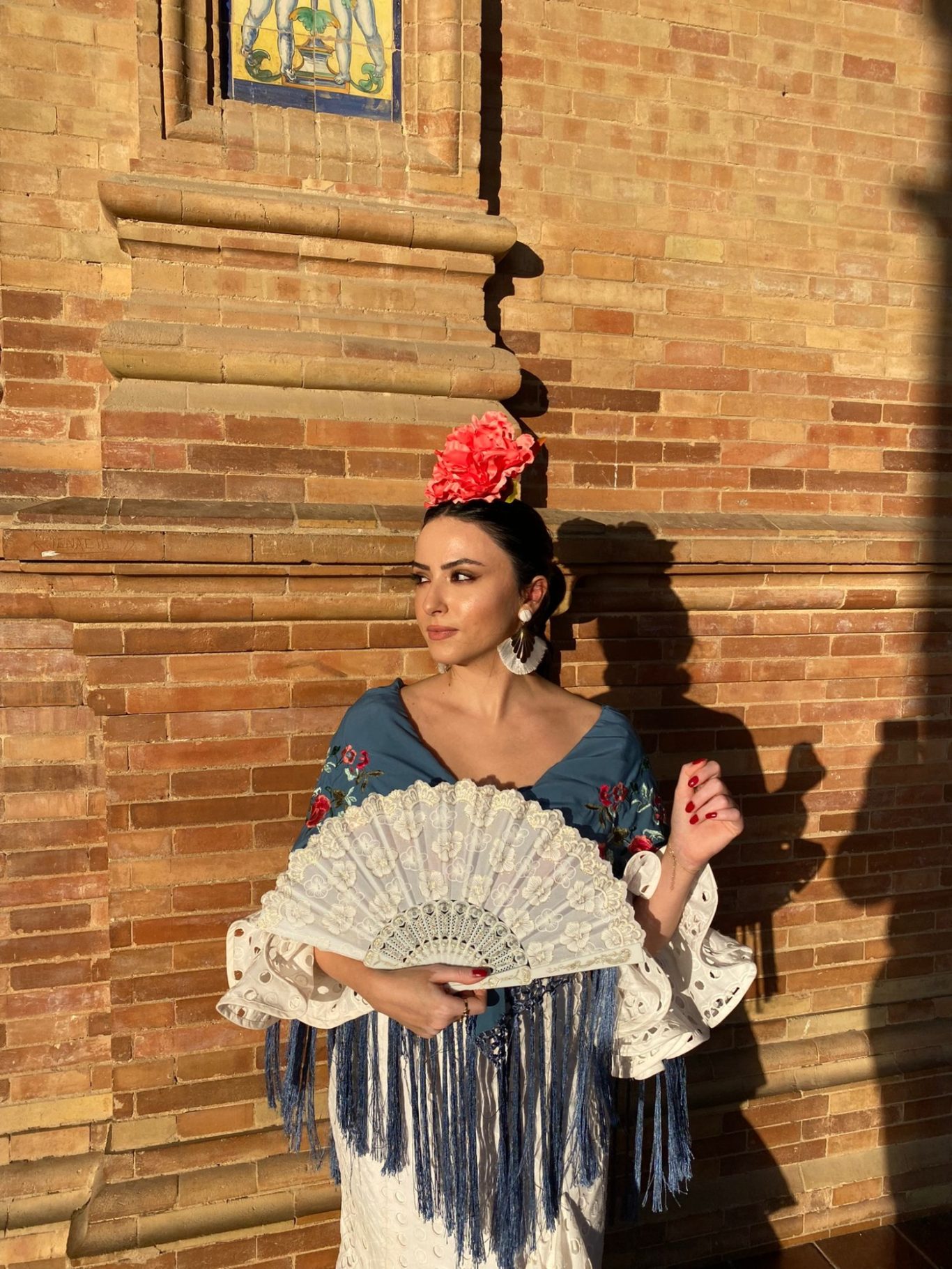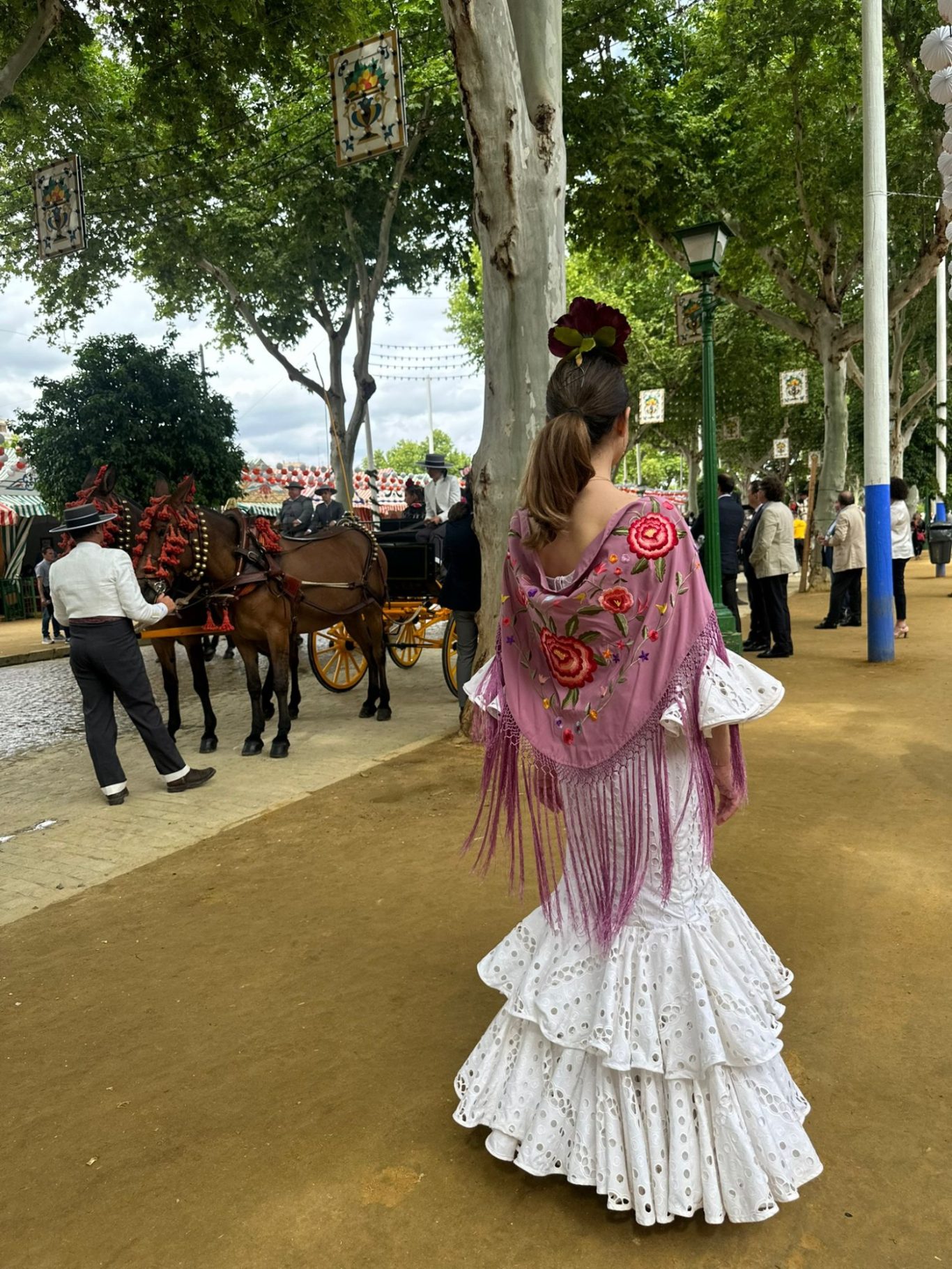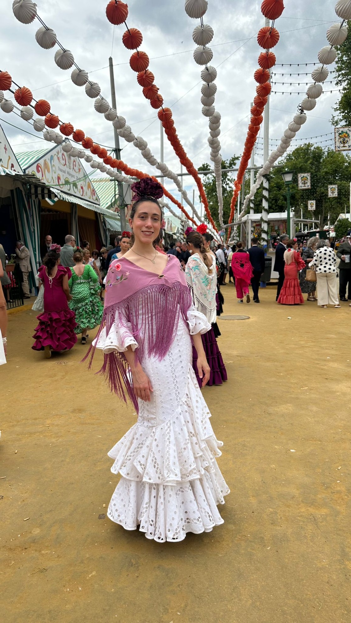 Traje de flamenca blanco en tejido de algodón perforado. Talle bajo con falda de tres volantes de capa y ligera subida en el volante superior. Mangas rematadas en volantes a juego con la falda. Escote redondeado en pecho y espalda.