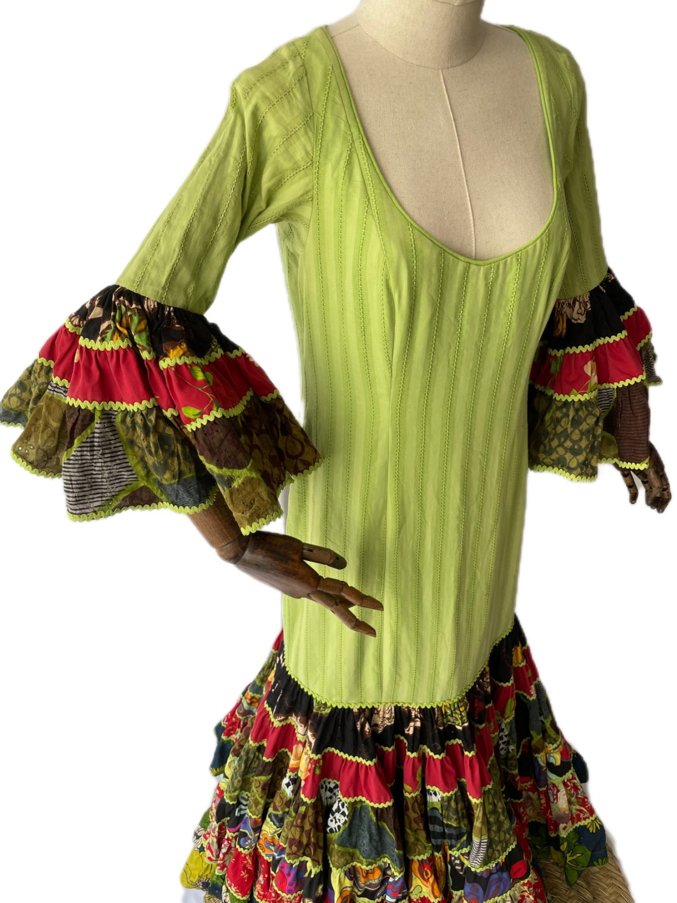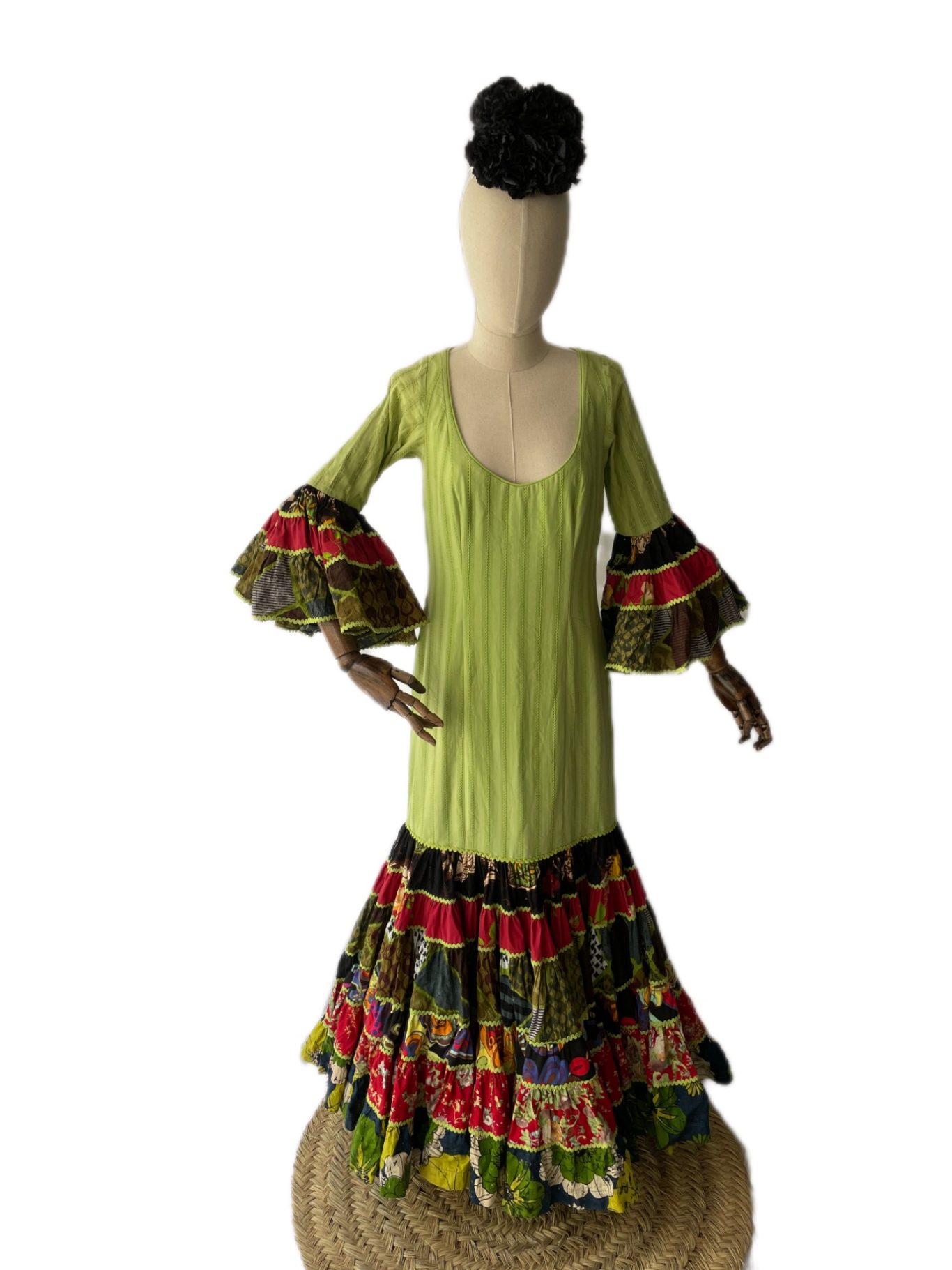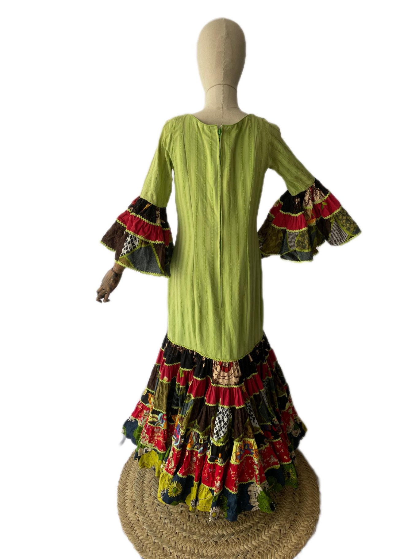 Traje de flamenca canastero combinado verde con estampado estilo patchwork. Cuerpo entallado y talle bajo, recto. Falda canastera de seis cortes. Manga larga rematada en volante canastero a juego con la falda. Escote redondeado por delante y espalda cerrada.