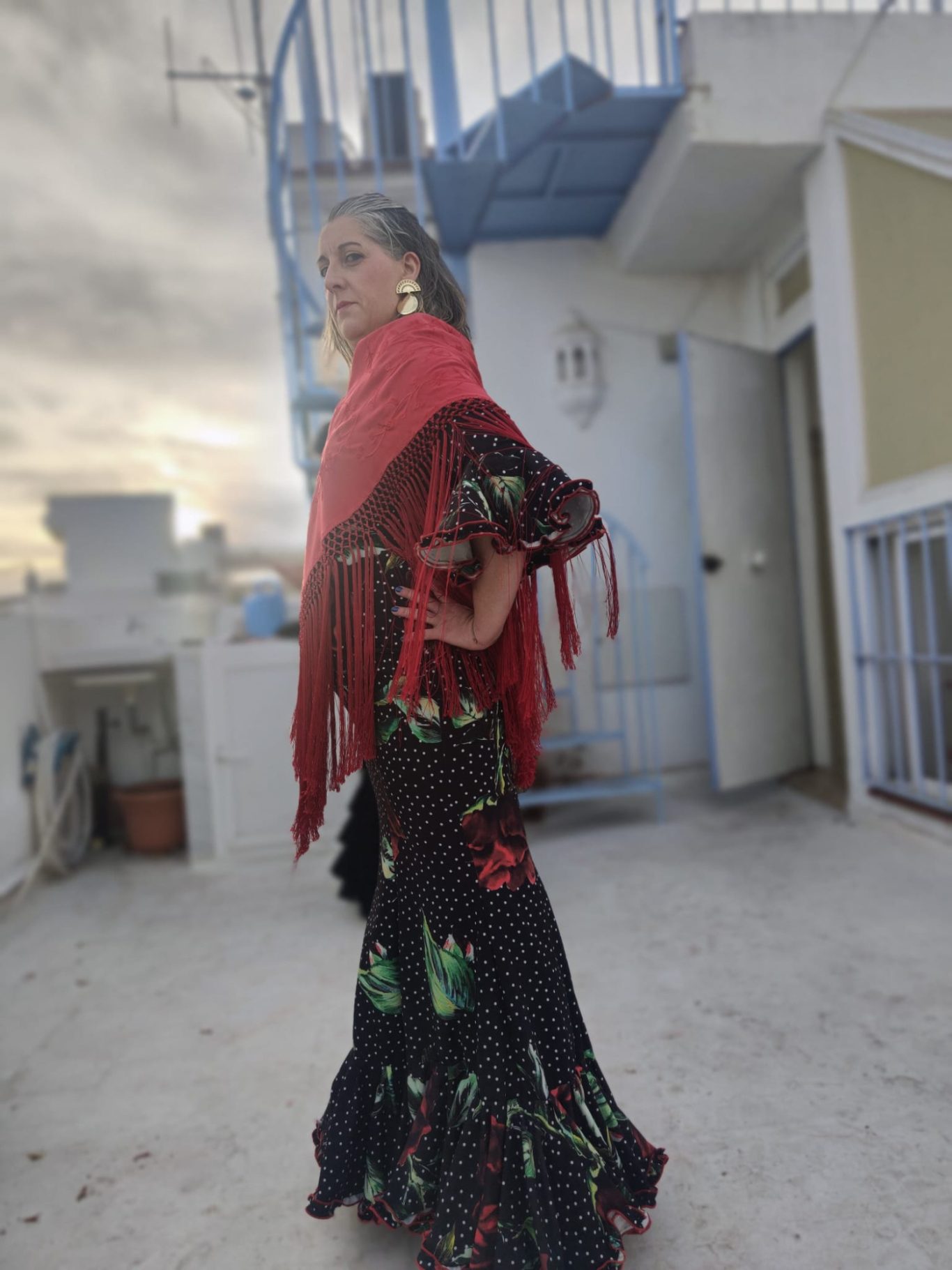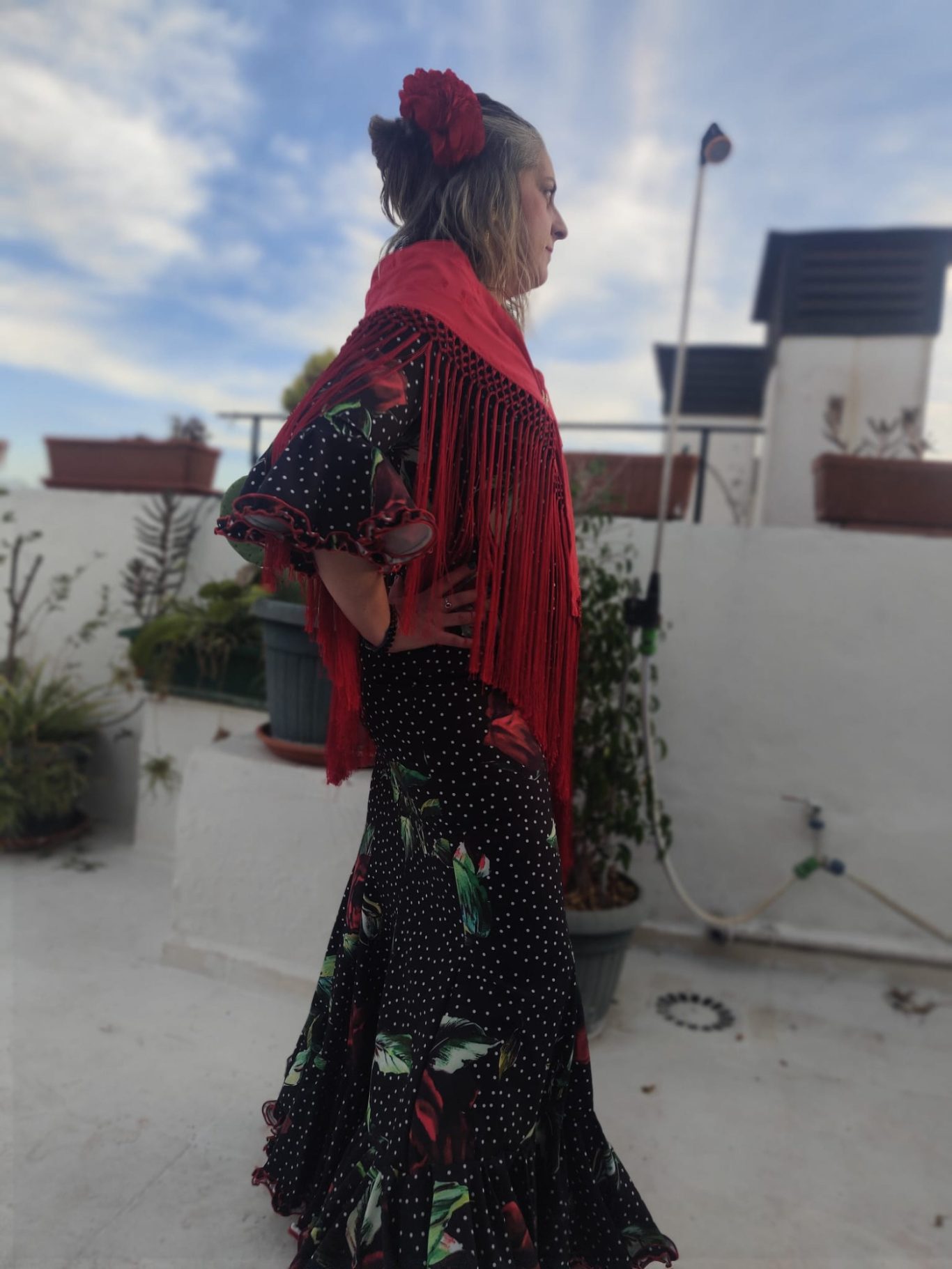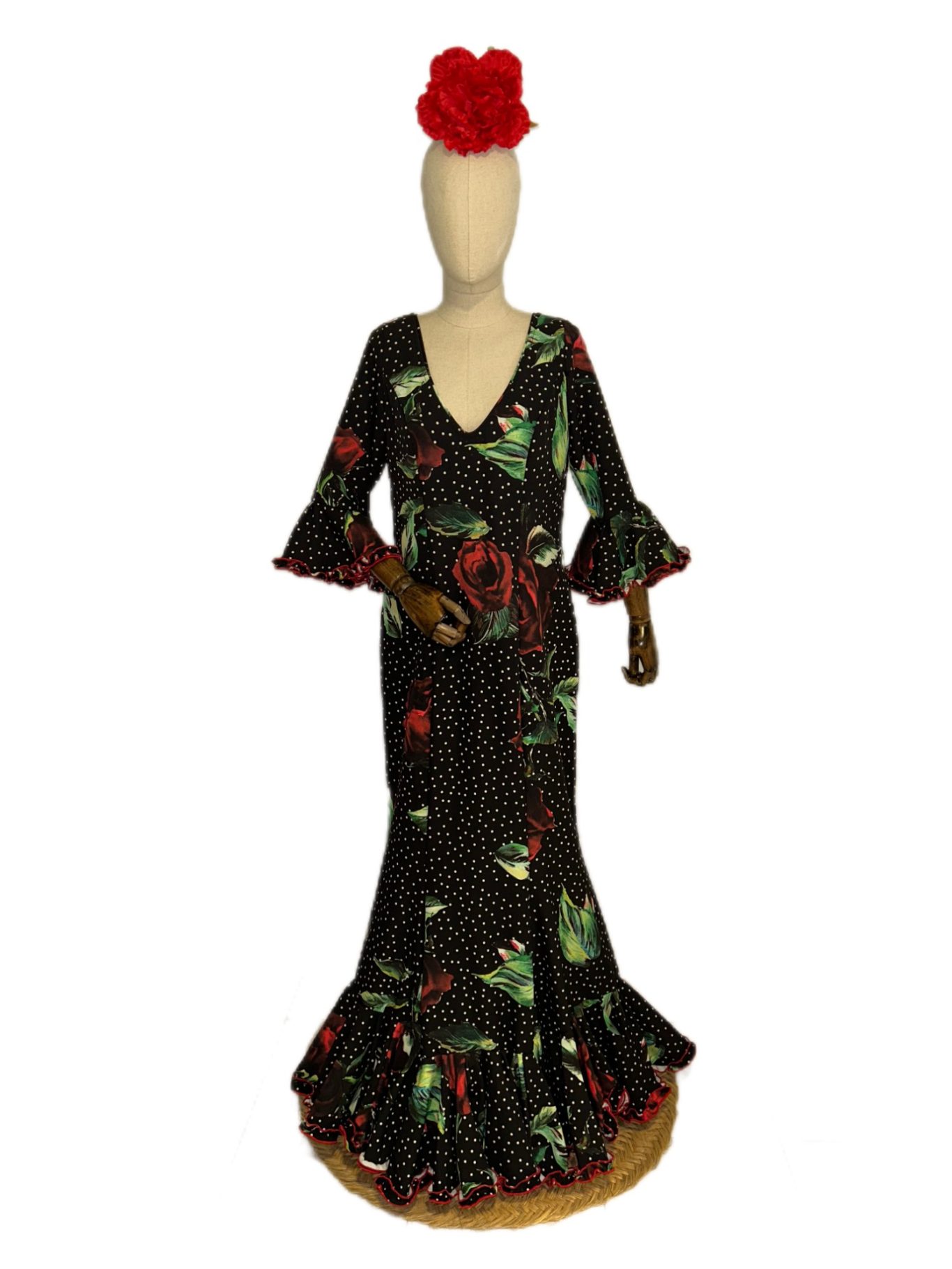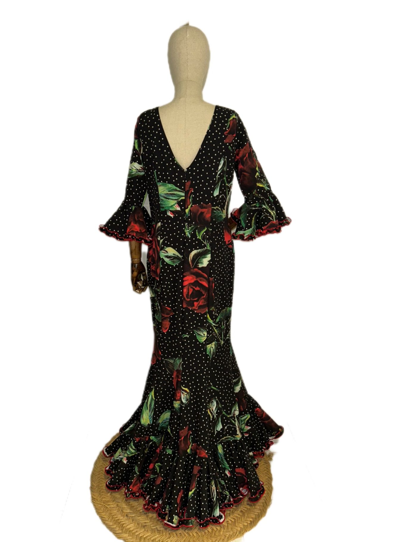 Traje de flamenca estampado floral sobre fondo negro. Cuerpo de nejas con volante abajo rematado con adorno plisado con repulgo rojo. Manga al codo rematada con volante y adorno a juego con la falda. Escote en V por delante y por detrás.