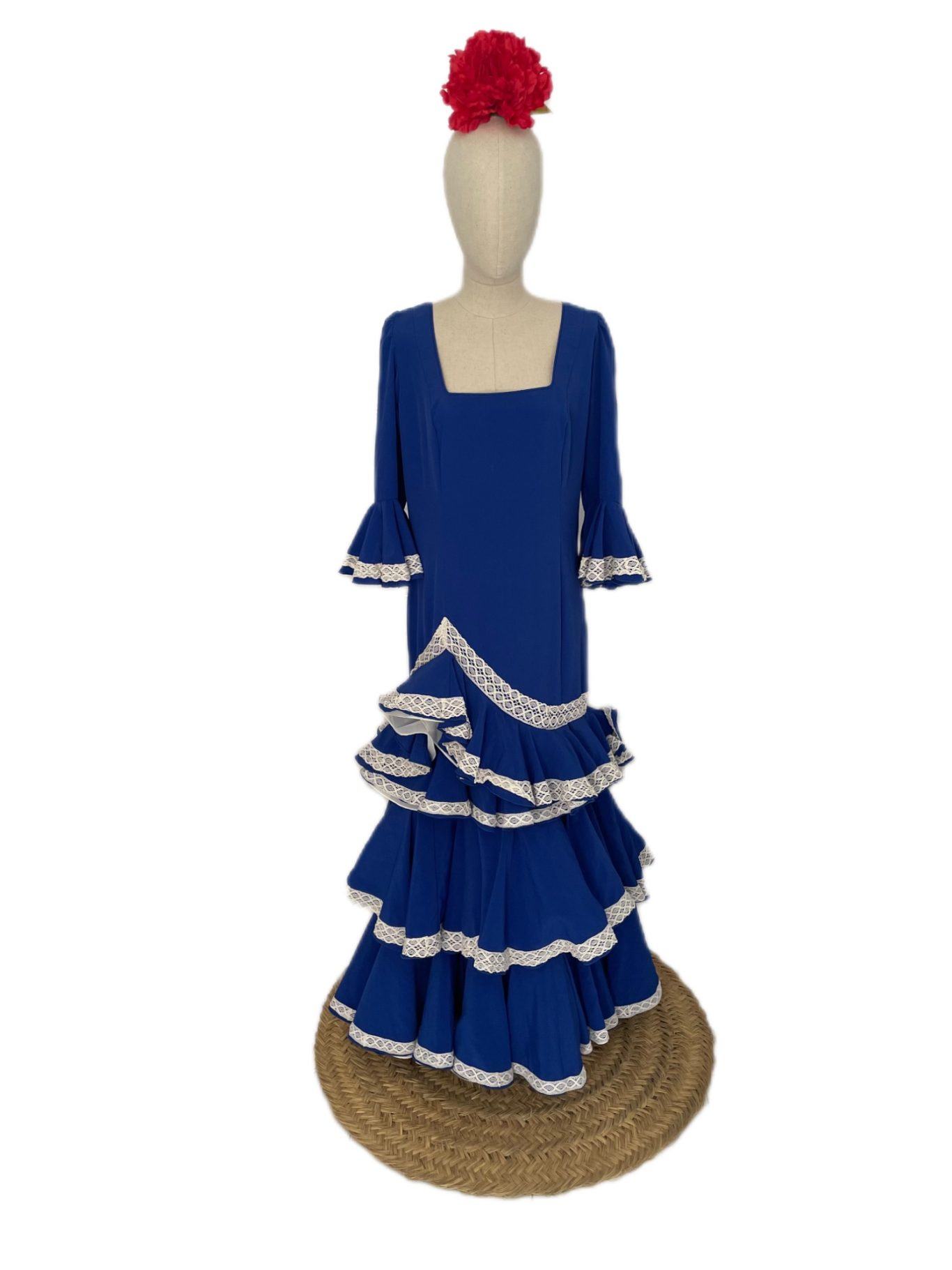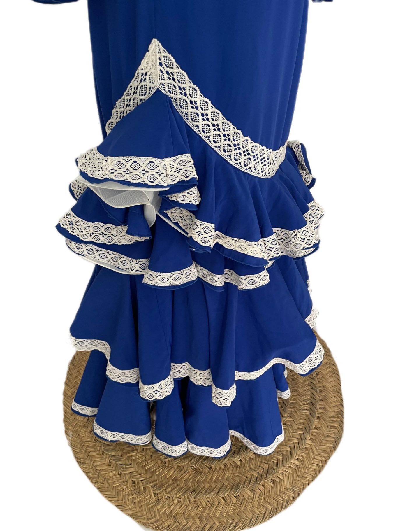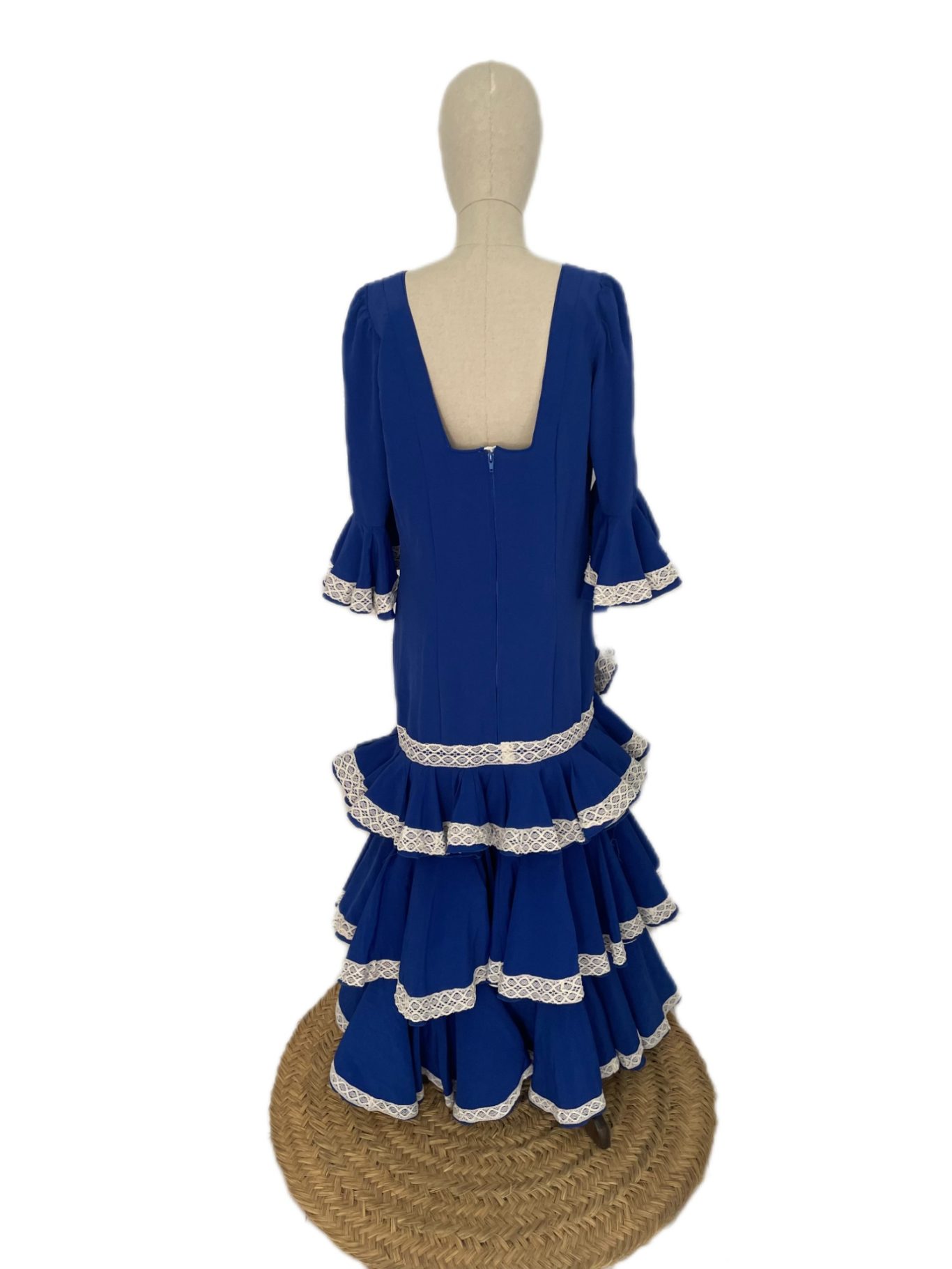Traje de flamenca color azul pavo real con adornos de encaje blanco. Tejido fluido, con caída. Cuerpo entallado. Talle bajo, que se eleva hacia la cadera para estilizar la figura. Falda con cuatro volantes de diferentes largos rematados con adornos de encaje blanco. Manga al codo rematada en volante de capa con adornos a juego con la falda. Escote cuadrado por delante y por detrás, pronunciado en la espalda.