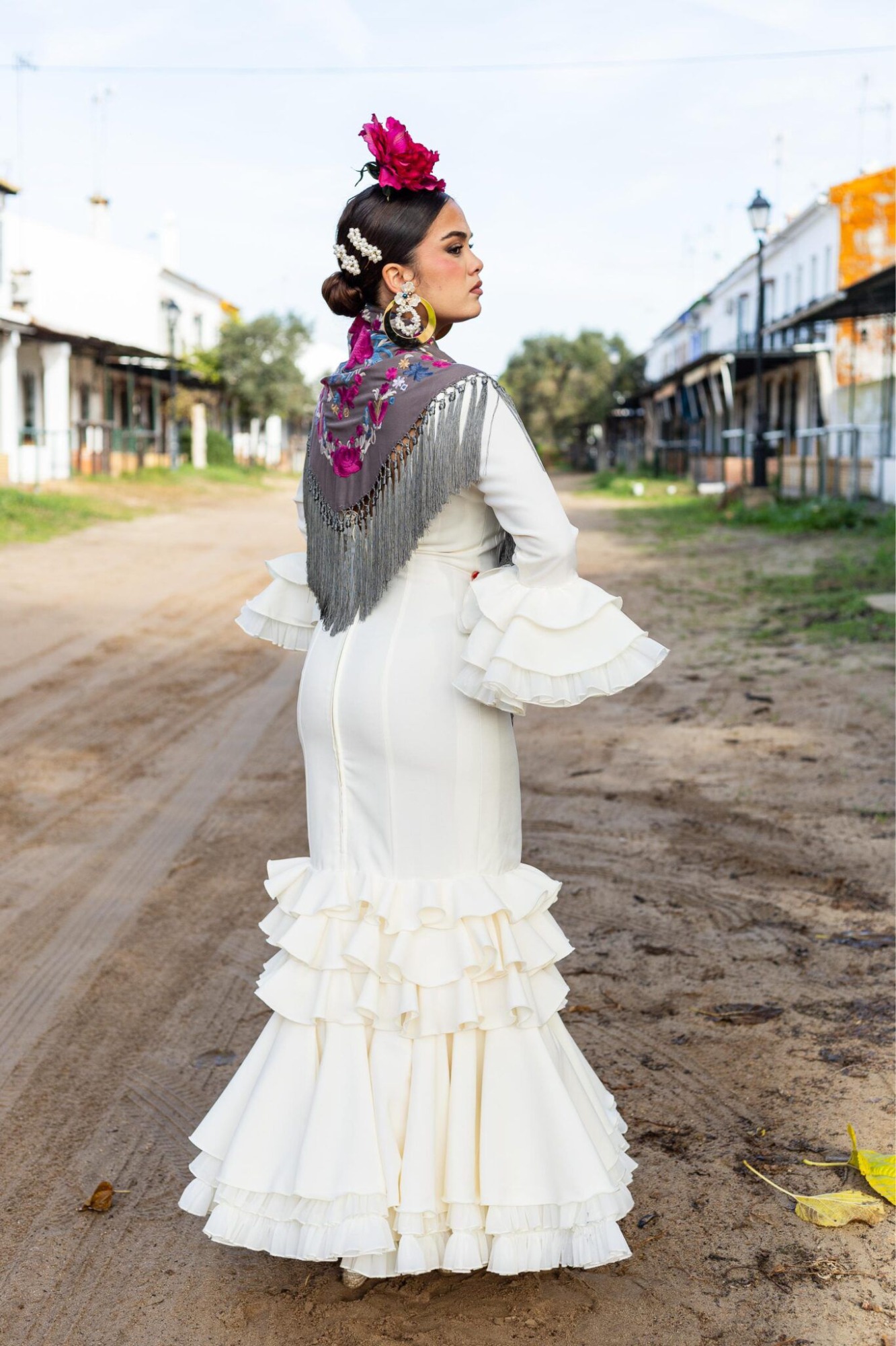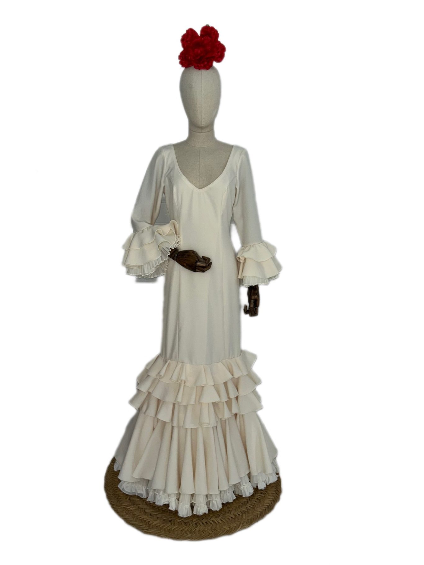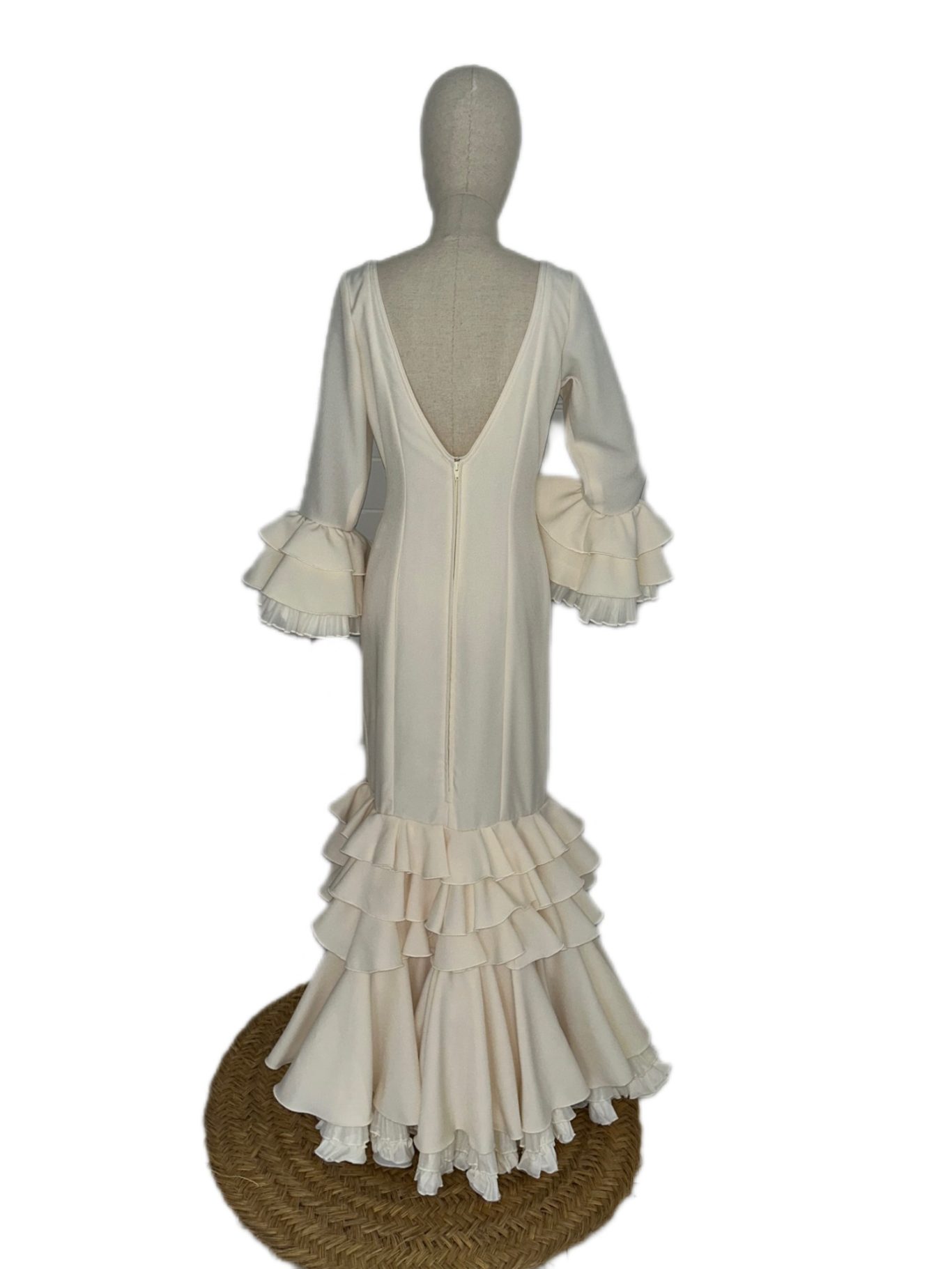 Traje de flamenca en strech beige con cuerpo entallado y talle recto adornado con un volante de capa con 3 volantes más pequeños en la parte superior. El remate de la falda deja ver unas enaguas de cancán al tono. Mangas largas con tres volantes de capa a juego de la falda.