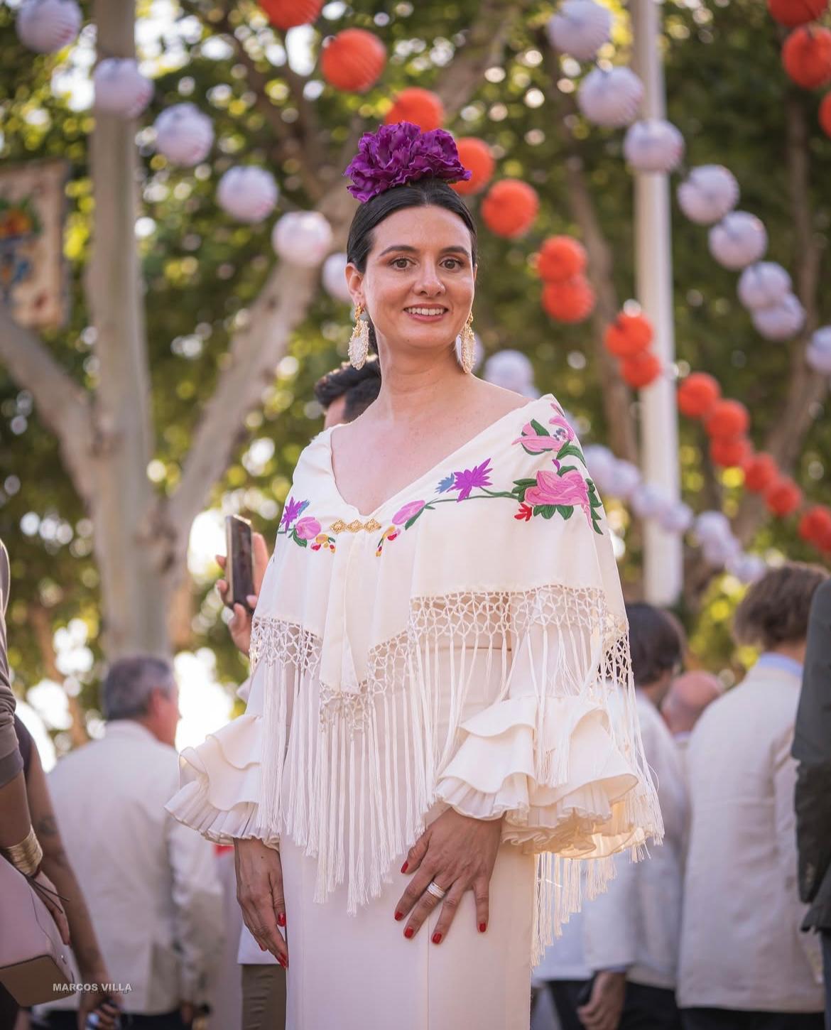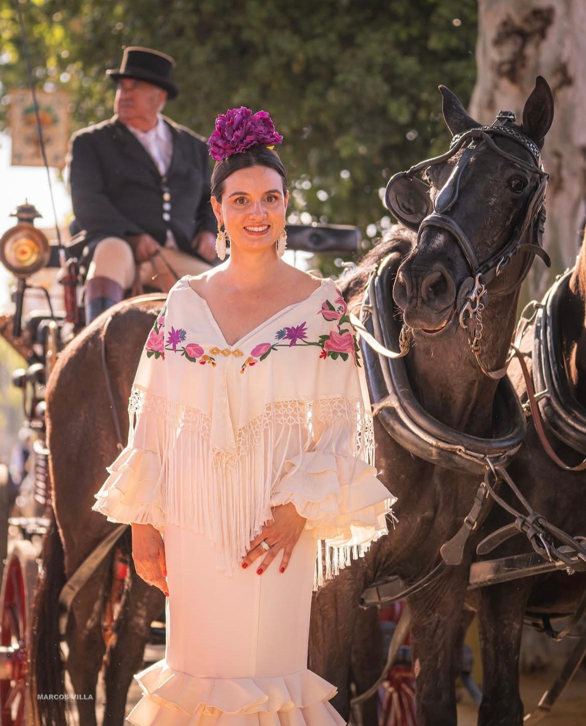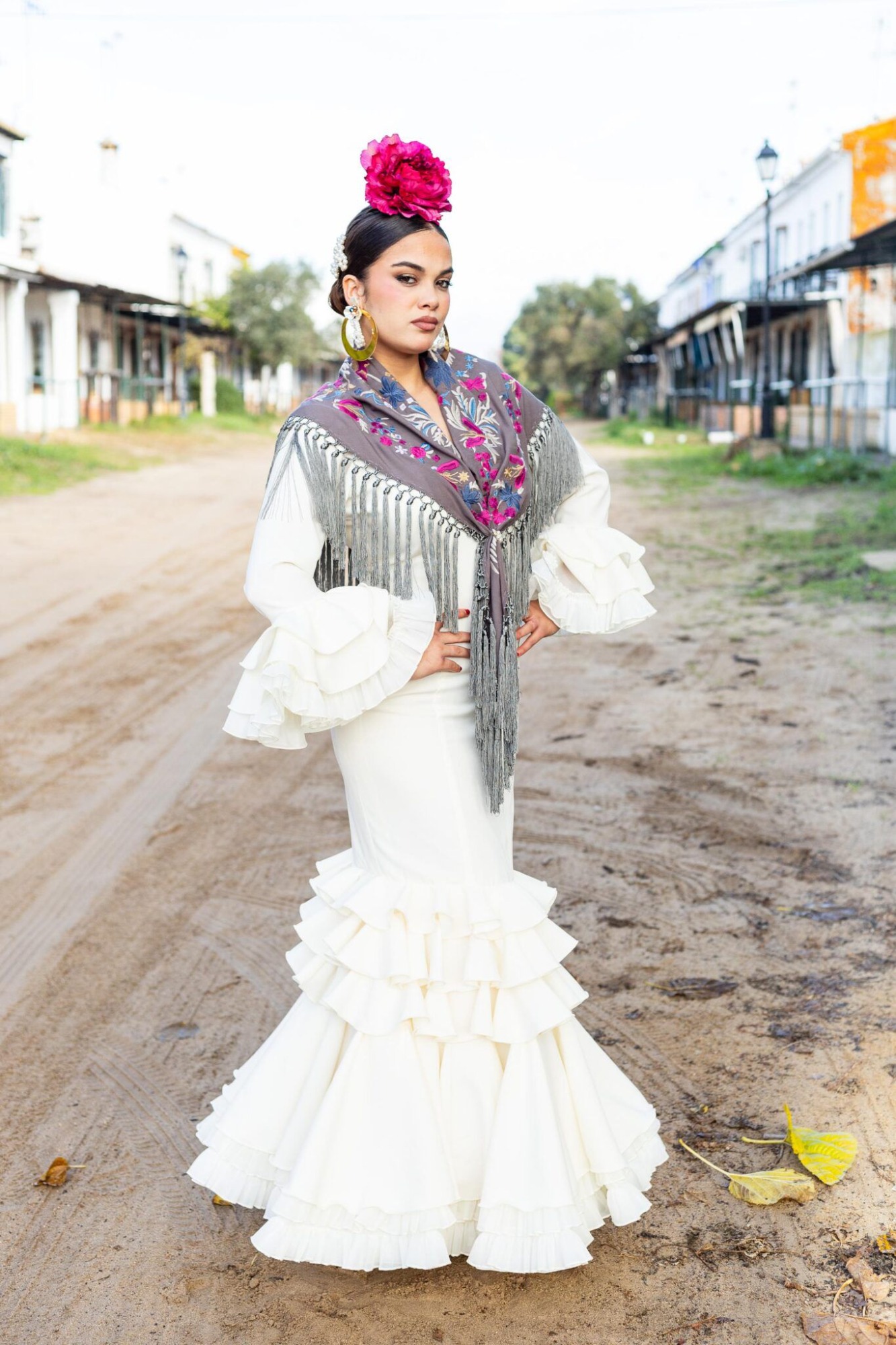 Traje de flamenca en strech beige con cuerpo entallado y talle recto adornado con un volante de capa con 3 volantes más pequeños en la parte superior. El remate de la falda deja ver unas enaguas de cancán al tono. Mangas largas con tres volantes de capa a juego de la falda.