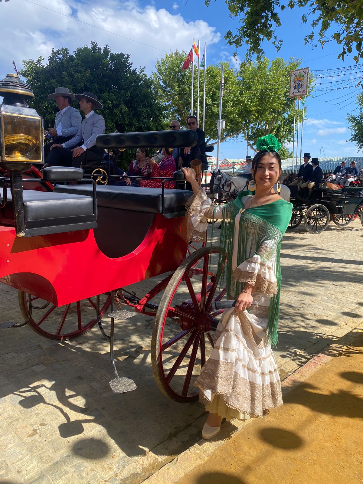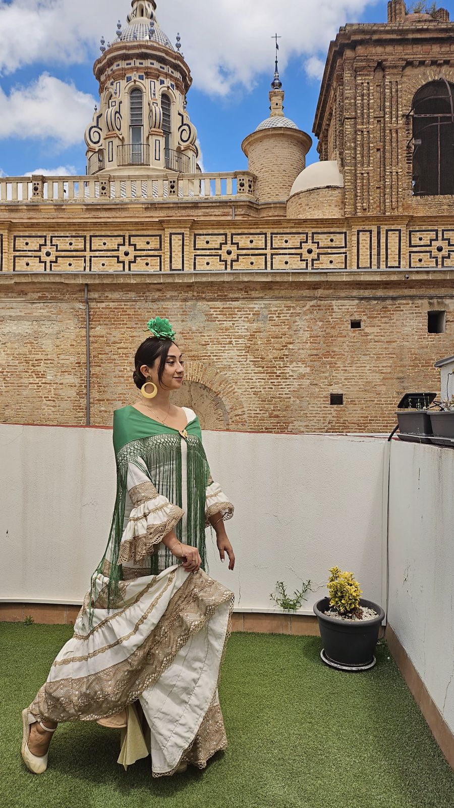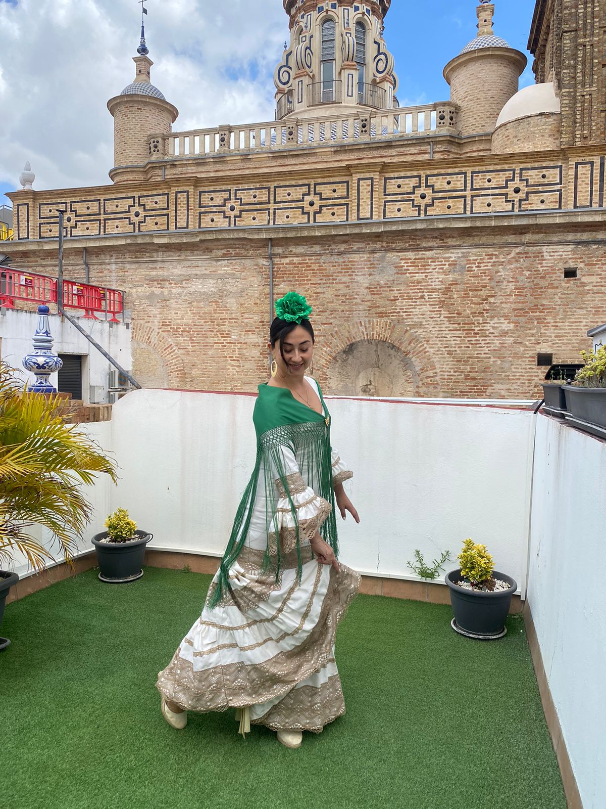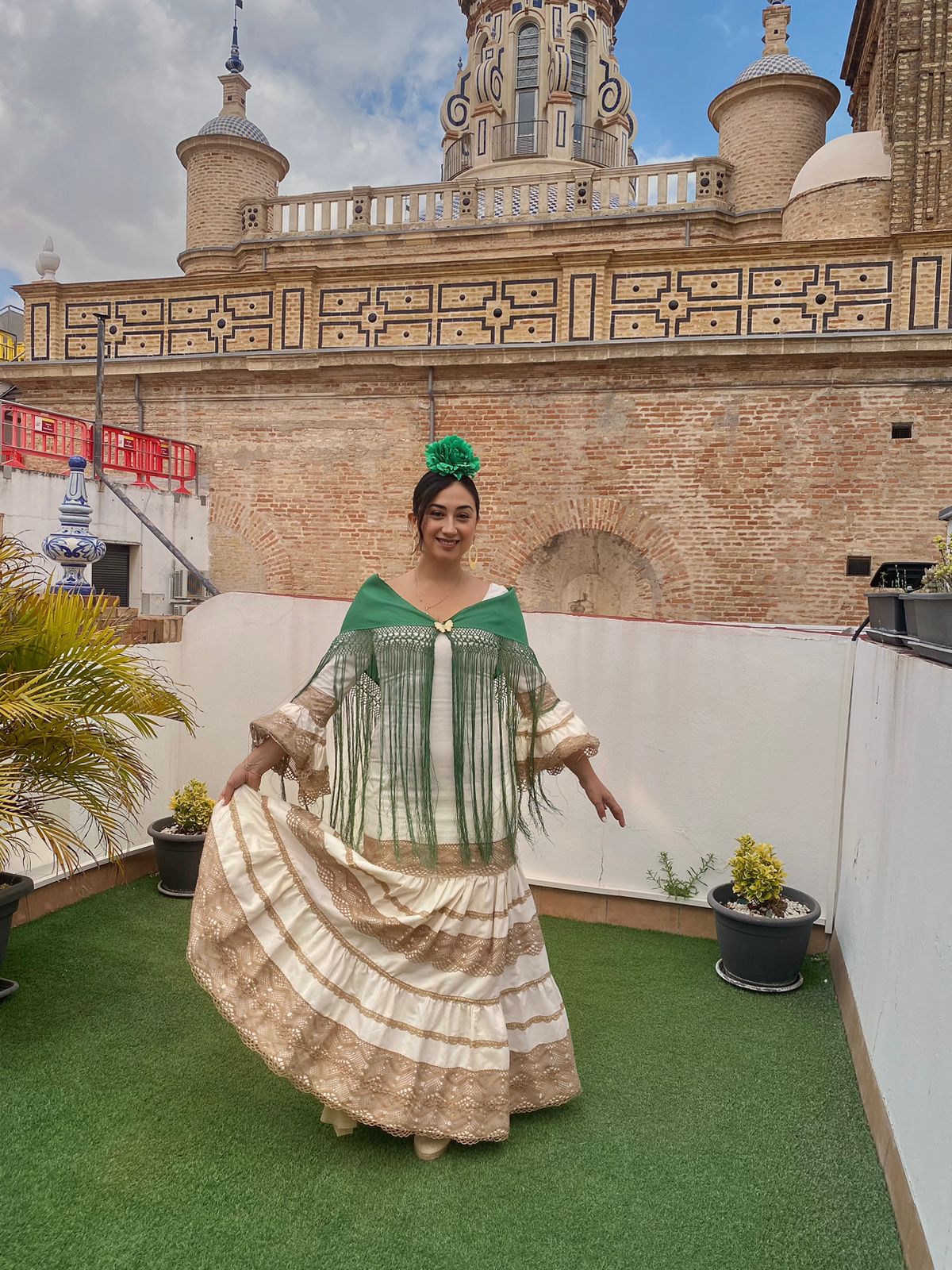 Traje de flamenca canastero confeccionado en tejido de piqué color crema con adornos de encaje color café con leche. Escote delantero redondeado y espalda de pico. Manga larga rematadas con volante canastero y adornos de encaje a juego con la falda.