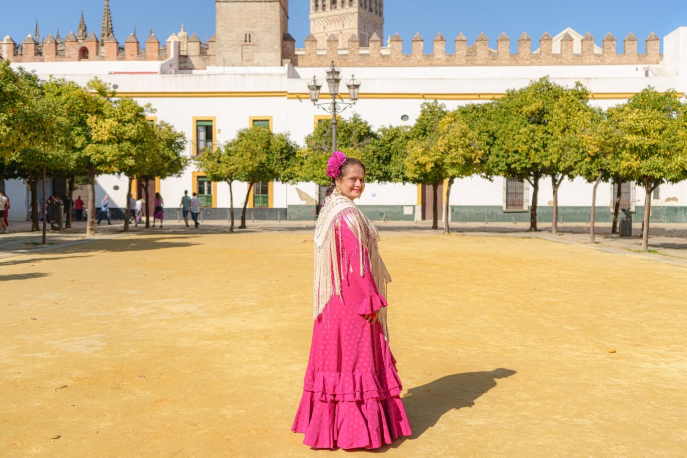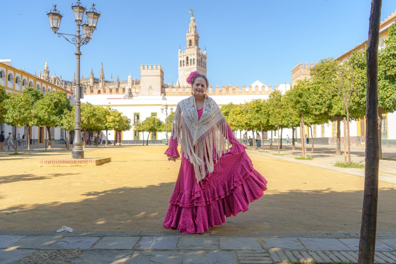 Traje de flamenca de Micaela Villa. Vestido de corte evassé confeccionado en jackard de poliester con diseño de lunares de 20 mm. El patrón con corte de nejas esta adornado con un gran volante de capa en el bajo y dos volantes pequeños que suben en espiral hacia uno de las costuras laterales.