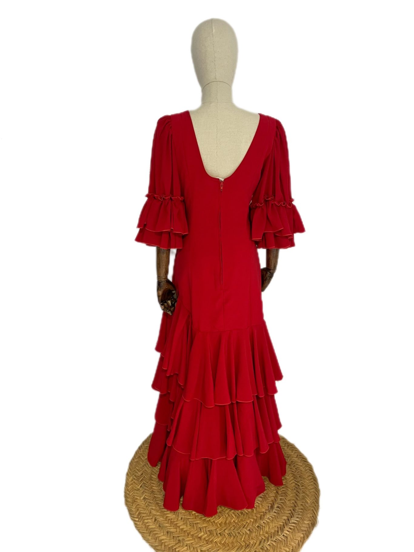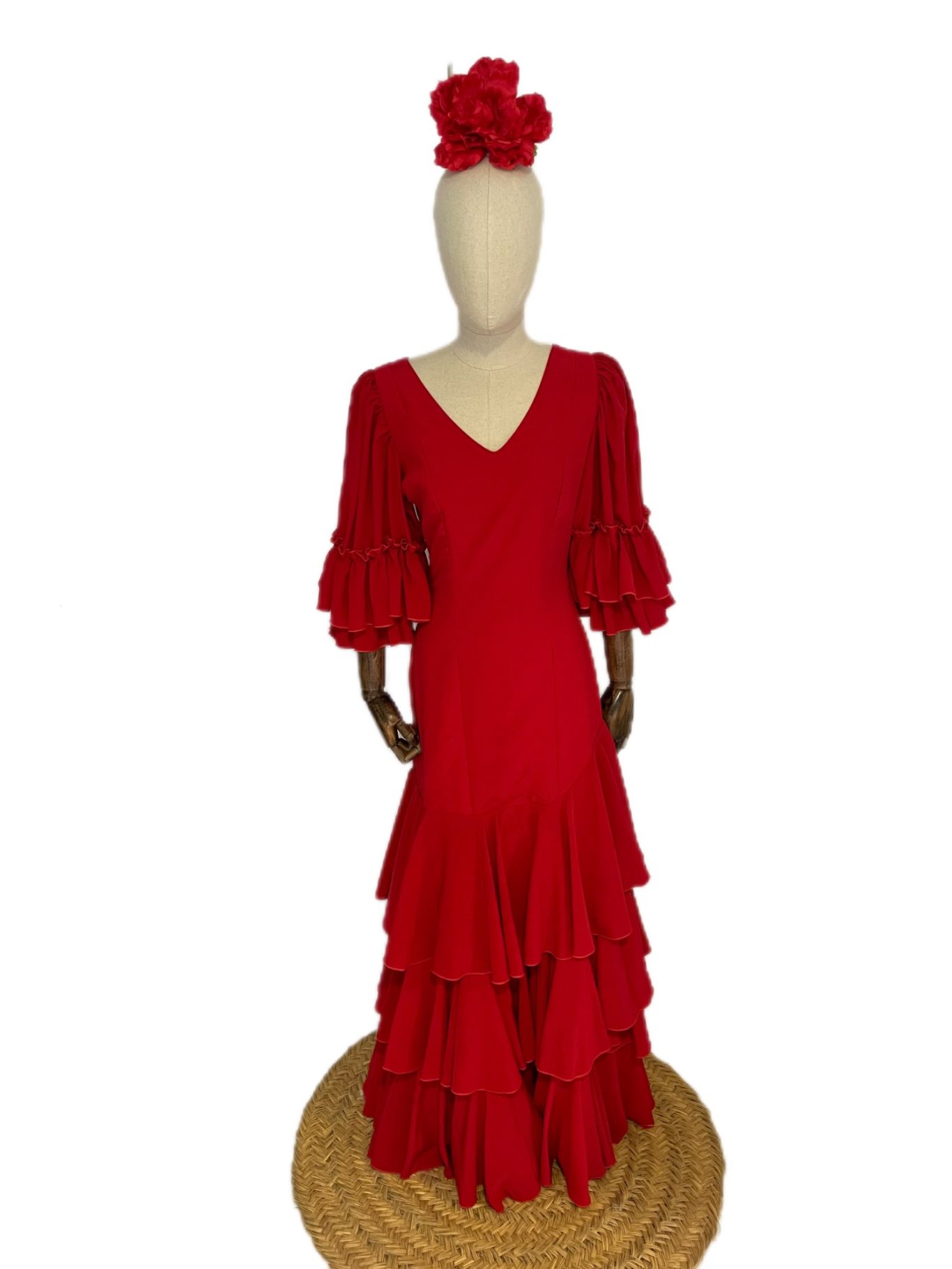 Traje de flamenca rojo. Tejido fluido. Cuerpo entallado y talle bajo, con ligera subida hacia la cadera para estilizar la figura. Falda de tres volantes de capa largos. Manga de farol al codo rematada con volantes. Escote en V por delante y por detrás.