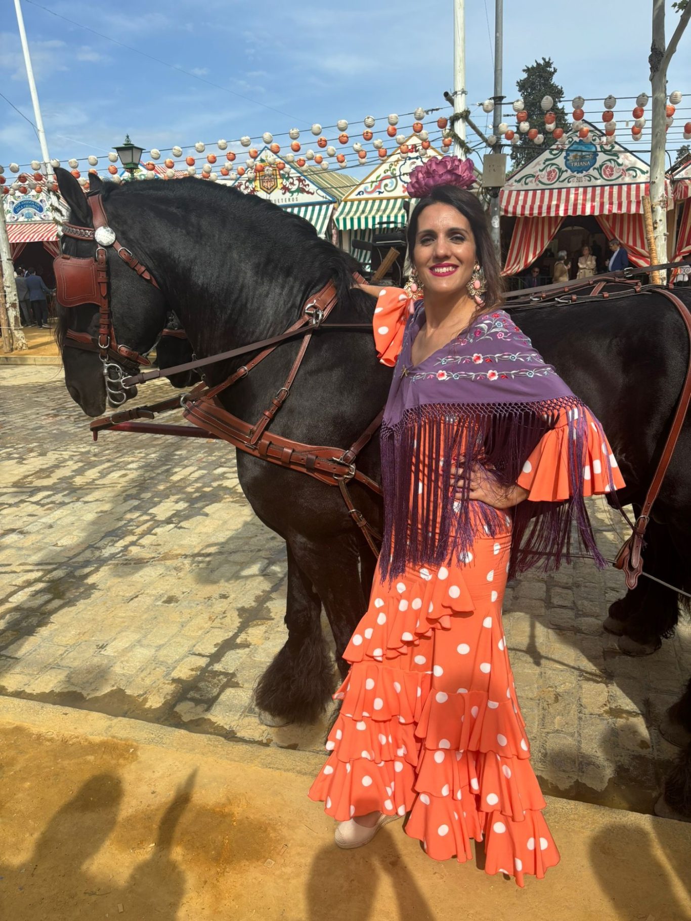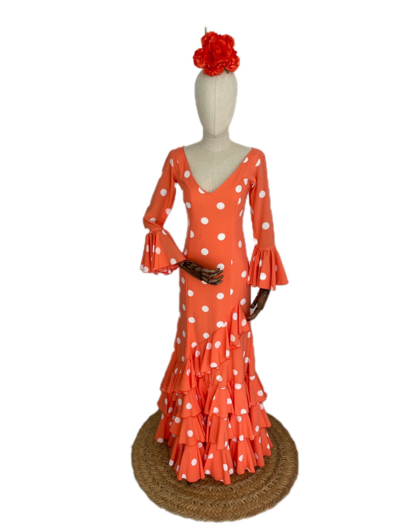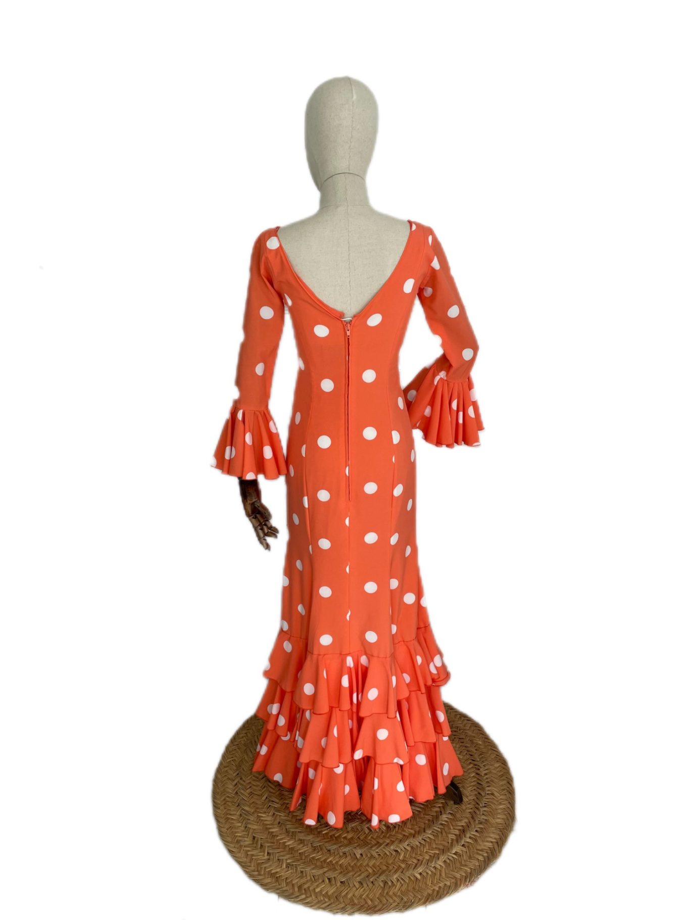 Traje de flamenca de Micaela Villa. Vestido de flamenca de fino tejido de poliester con mezcla de elastano con lunares de 30 mm. Patrón con nejas, entallado hasta caderas, desde donde comienza a abrirse hasta el bajo. Adornado con tres líneas de volantes de capa de tamaño medio. El volante superior está cosido en espiral. Los volantes están rematados con repulgo al tono. No lleva falda interior ni cancan. Lleva bolsillo interior en el lateral y presillas de cuelgue en las costuras laterales interiores. Las mangas de corte al codo y rematadas con un volante. El escote es de pico en delantero y espalda.