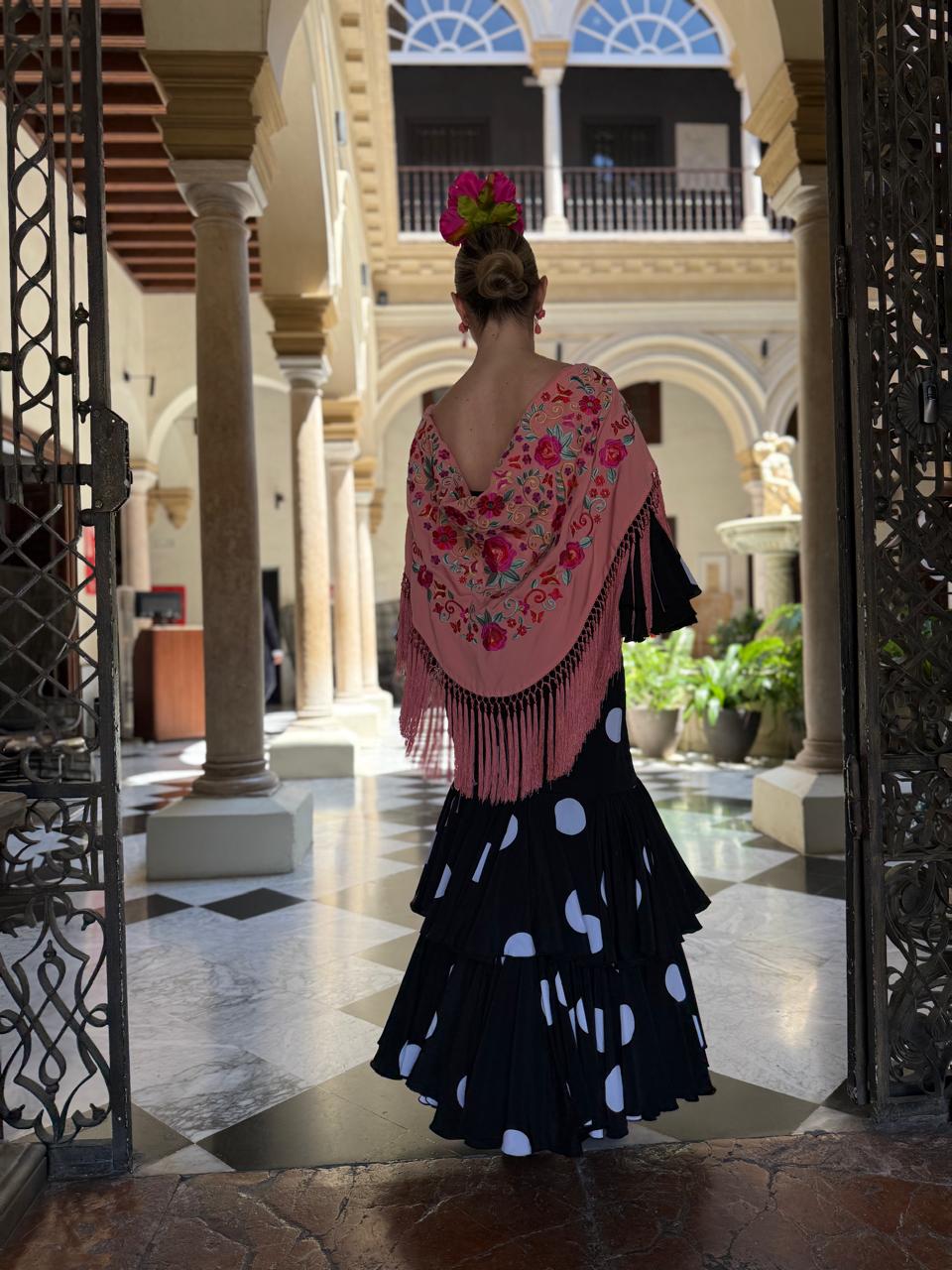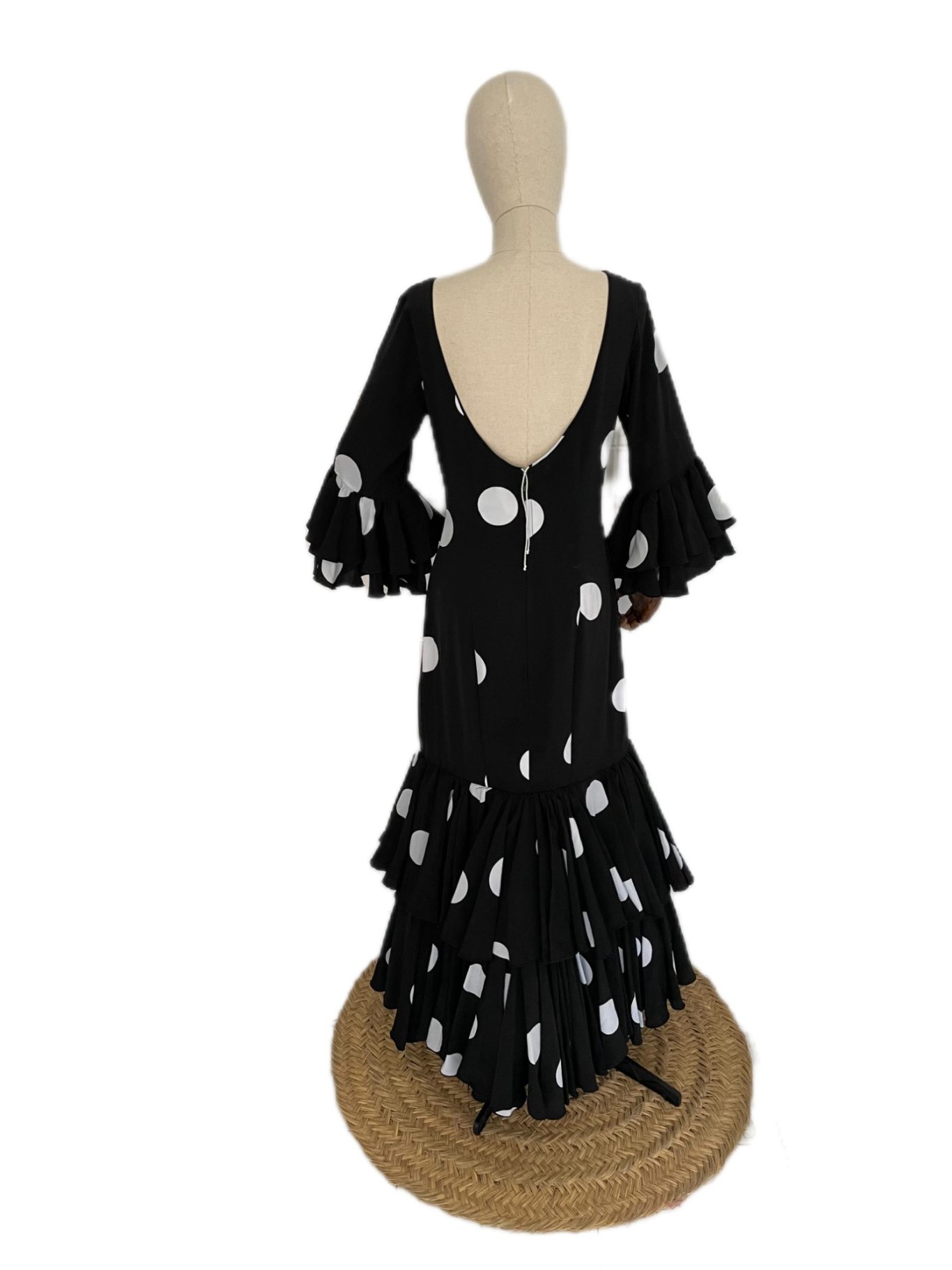 Traje de flamenca confeccionado en crespón negro con lunares grandes dispersos blancos. Cuerpo entallado, talle bajo, recto. Falda con dos volantes de capa grandes. Manga al codo rematada en dos volantes de capa a juego con la falda. Escote redondo por delante y por detrás, pronunciado en la espalda.