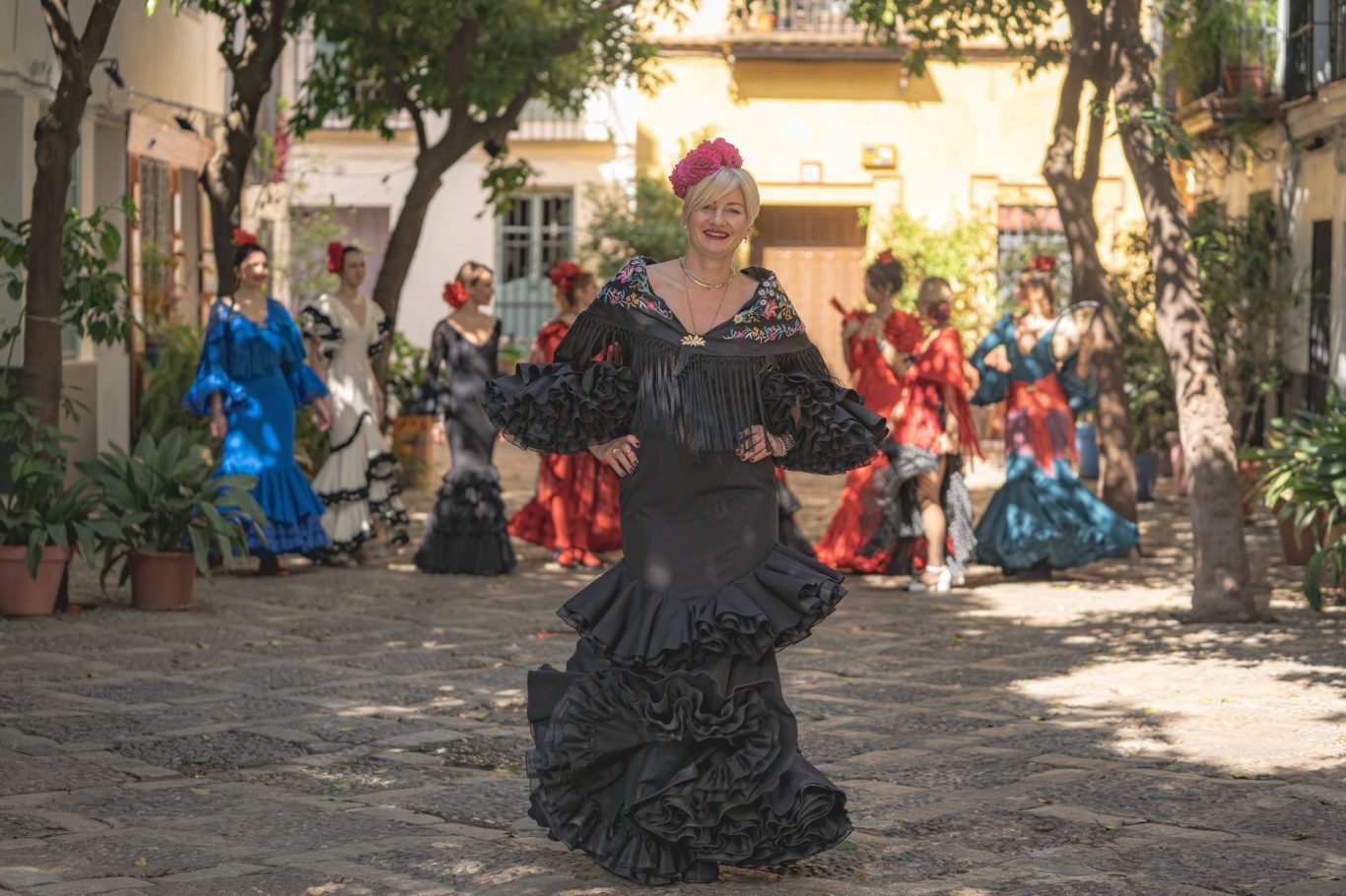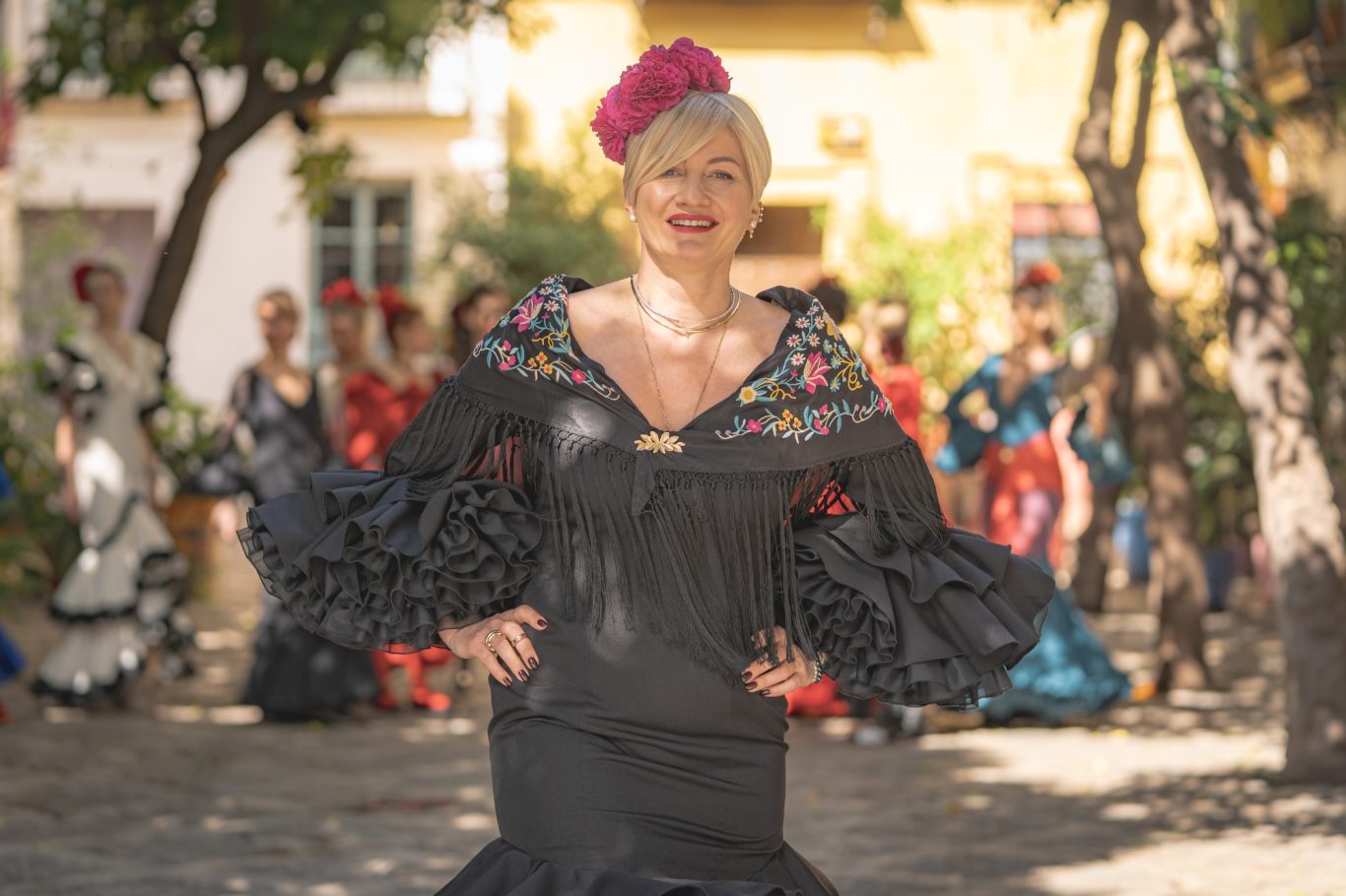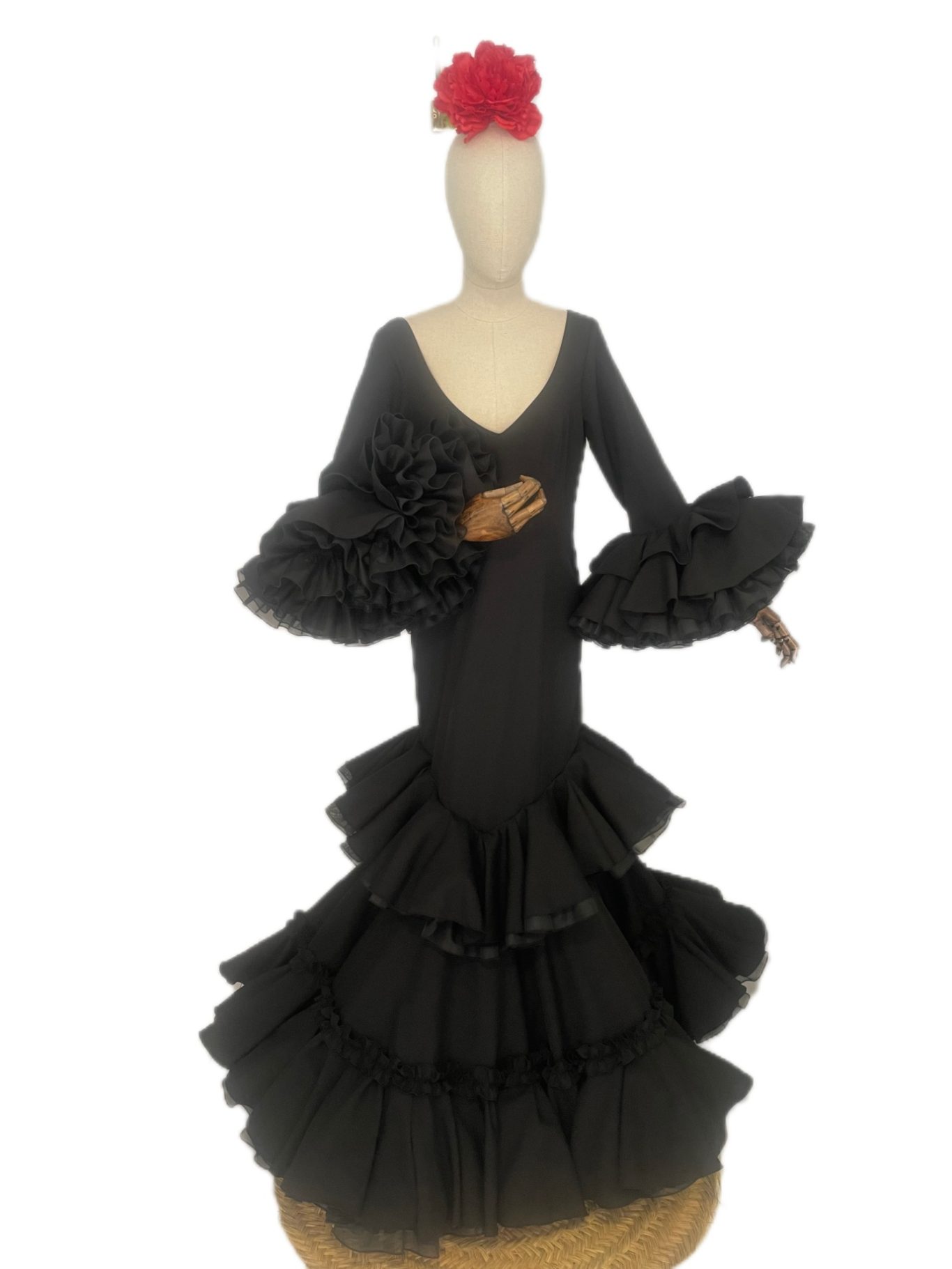 Espectacular traje de flamenca del diseñador Alejandro Andana. Cuerpo entallado. Talle bajo. Falda rematada en volante bajo con adorno de mini volante. Se adorna además con volante en forma de V para estilizar la figura y enagua de organdí para dar volumen y ligereza. Manga larga rematada en dos volantes con enagua de organdí. Escote en V por delante y por detrás, pronunciado en la espalda.