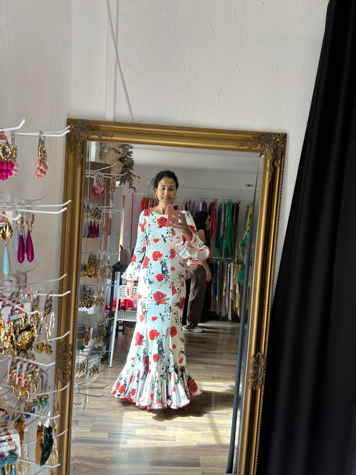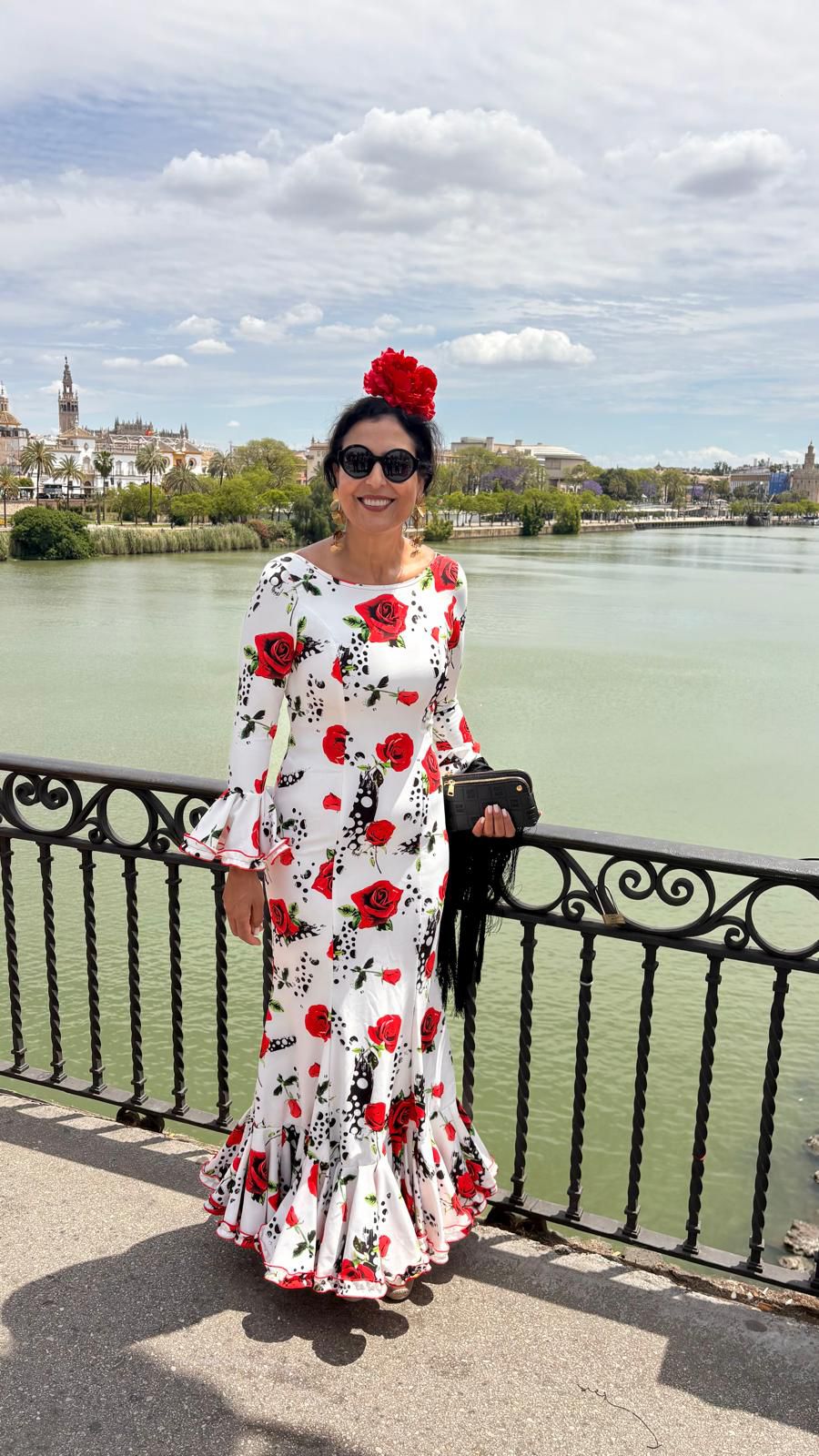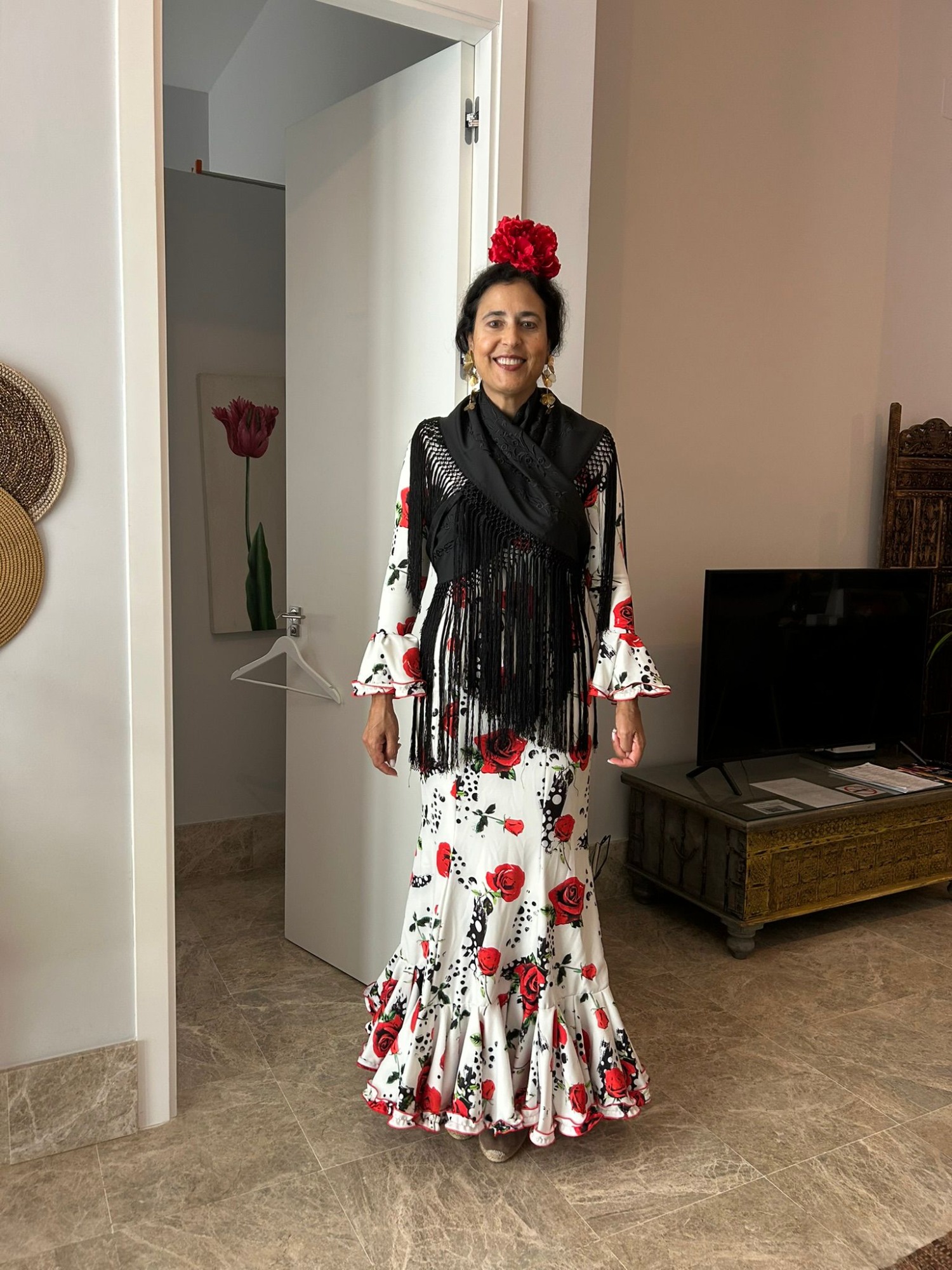 Traje de flamenca blanco con estampado de rosas rojas. Tejido elástico. Cuerpo entallado de nejas y talle bajo, recto y falda acabada en un volante bajo rematado en adorno plisado con repulgo rojo. Manga larga rematada con volante y adorno a juego con la falda. Escote delantero cerrado y espalda de pico.