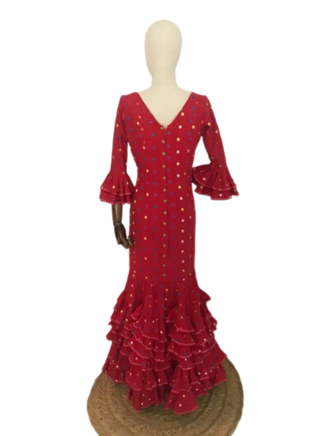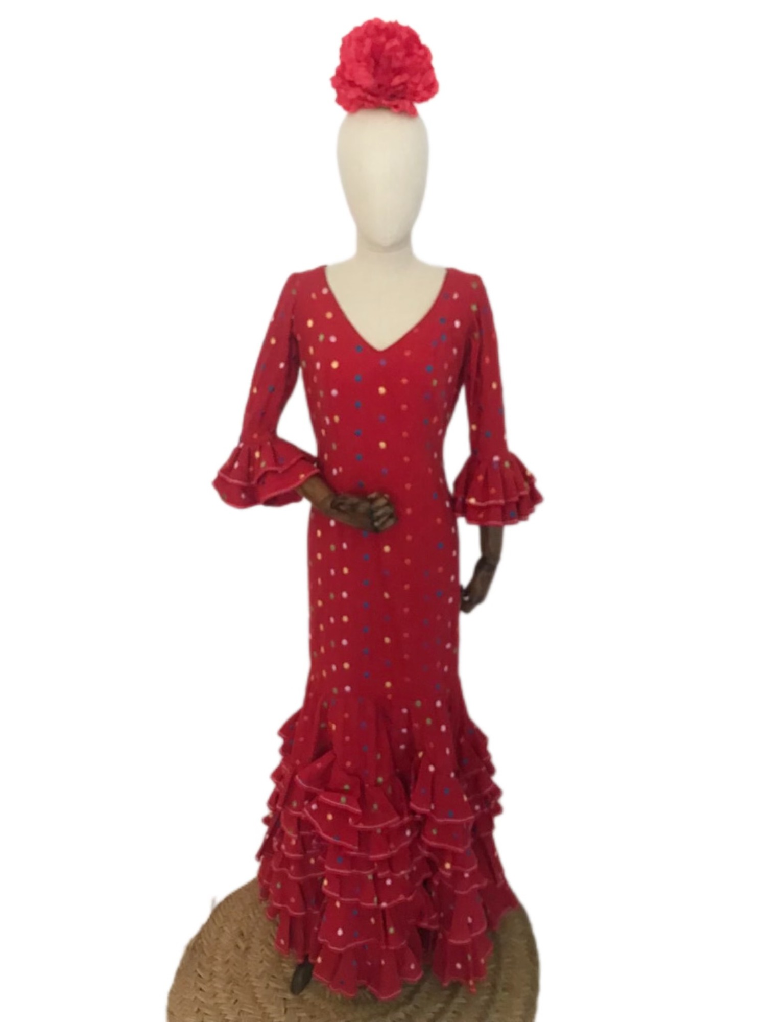 Traje de flamenca rojo con lunares de colores bordados de la prestigiosa firma Pol Nuñez.
