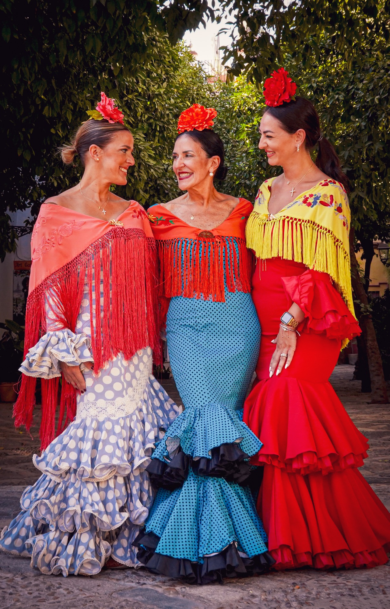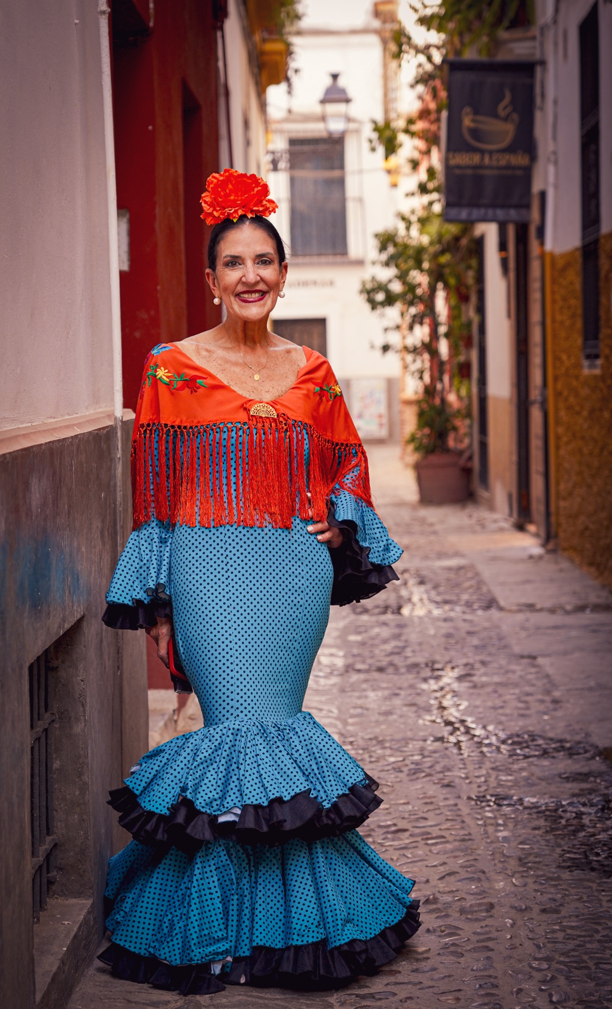 Traje de flamenca azul con lunarillos negros cabeza de alfiler. Tejido elástico. Talle bajo, recto. Falda con dos volantes dobles con cancán negro. Manga larga rematada en volante doble con cancán negro a juego con la falda. Escote en V por delante y por detrás.